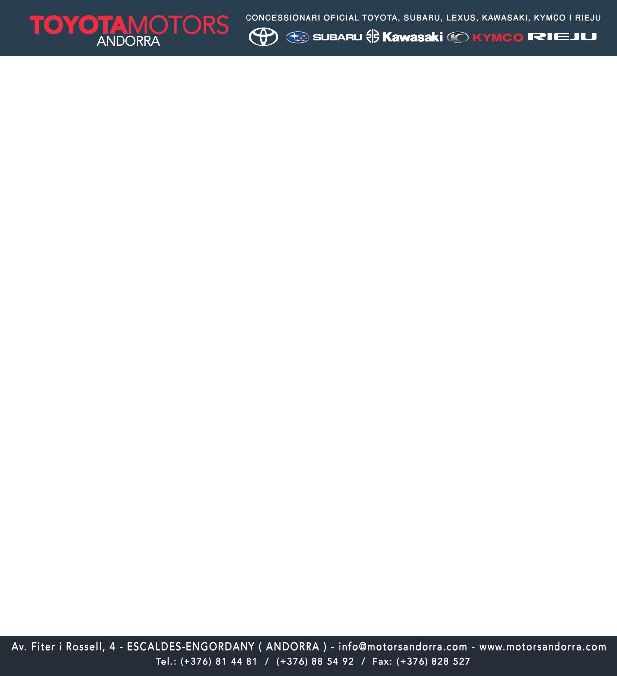 Si us interessa, sapigueu que està disponible al concessionari escaldenc, per 62.700 euros. Toyota Motors està a l’Av. Fiter i Rossell, 4. Tel. +376 814481