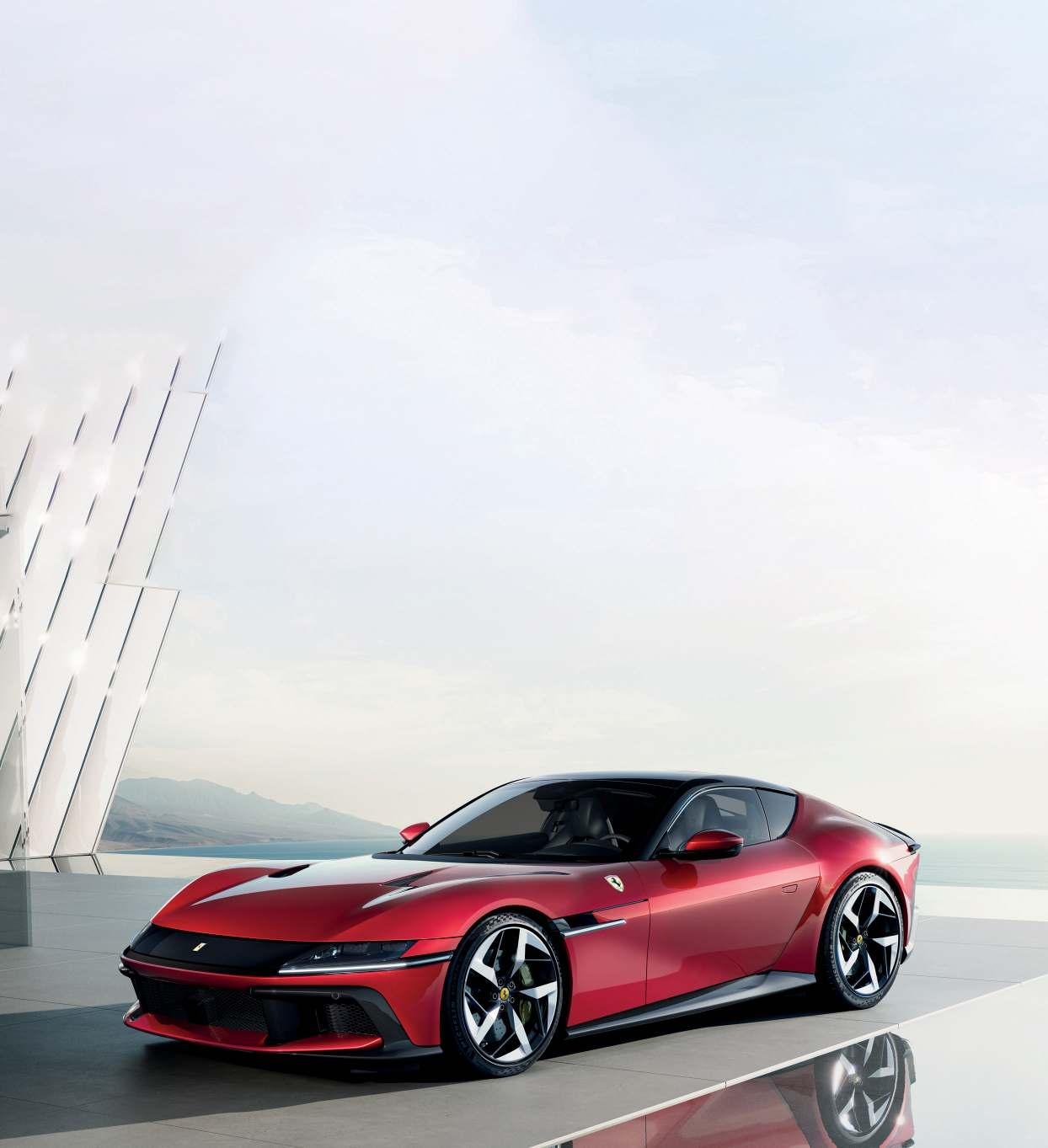 Tornant a l’exterior. La motllura de color fosc que portaven algunes de les versions del llegendari Daytona és un dels recursos que han recuperat per al 12Cilindri i que més l’identifica. Aquest element unit als fars rectangulars, també de color fosc, subratllats per unes llums diürnes extra fines, no només reforcen la bellesa del cotxe vist frontalment, també anuncien l’harmonia que desborda lateralment, amb línies molt fluides que justament arranquen des de les mateixes cantonades frontals.