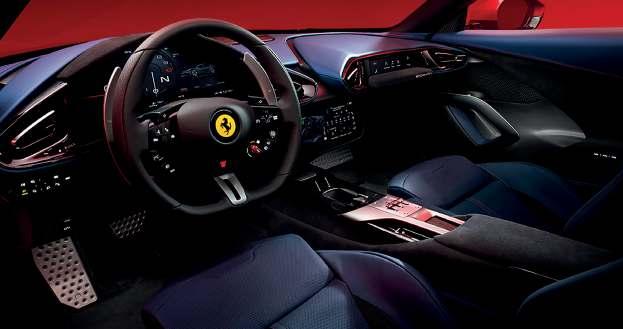 El lloc de conducció dibuixa tres zones o nivells amb un to de color diferent cadascuna. D’altra banda, seguint amb la tendència de la indústria pel que fa a la digitalització i comunicació, el 12Cilindri inclou tres pantalles. Per un costat tenim la de 16,5 polzades del quadre de comandaments del pilot. En segon lloc, hi ha la pantalla central de 12,2 i finalment la de 8,8 polzades del copilot, més fina i allargada.