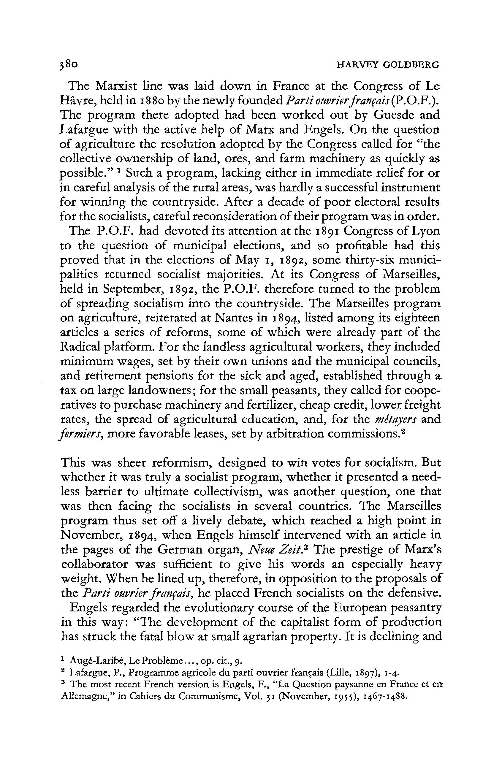 The Marxist line was laid down in France at the Congress of Le Havre, held in 1880 by the newly founded Parti ouvrierfran$ais(P.O.F.). The progra m there adopted had been worked out by Guesde and Lafargue with the active help of Marx and Engels. O n the question of agriculture the resolution adopted by the Congress called for "the collective ownership of land, ores, and farm machinery as quickly as possible." x Such a program, lacking either in immediate relief for or in careful analysis of the rural areas, was hardly a successful instrument for winning the countryside. After a decade of poo r electoral results for the socialists, careful reconsideration of their program was in order.