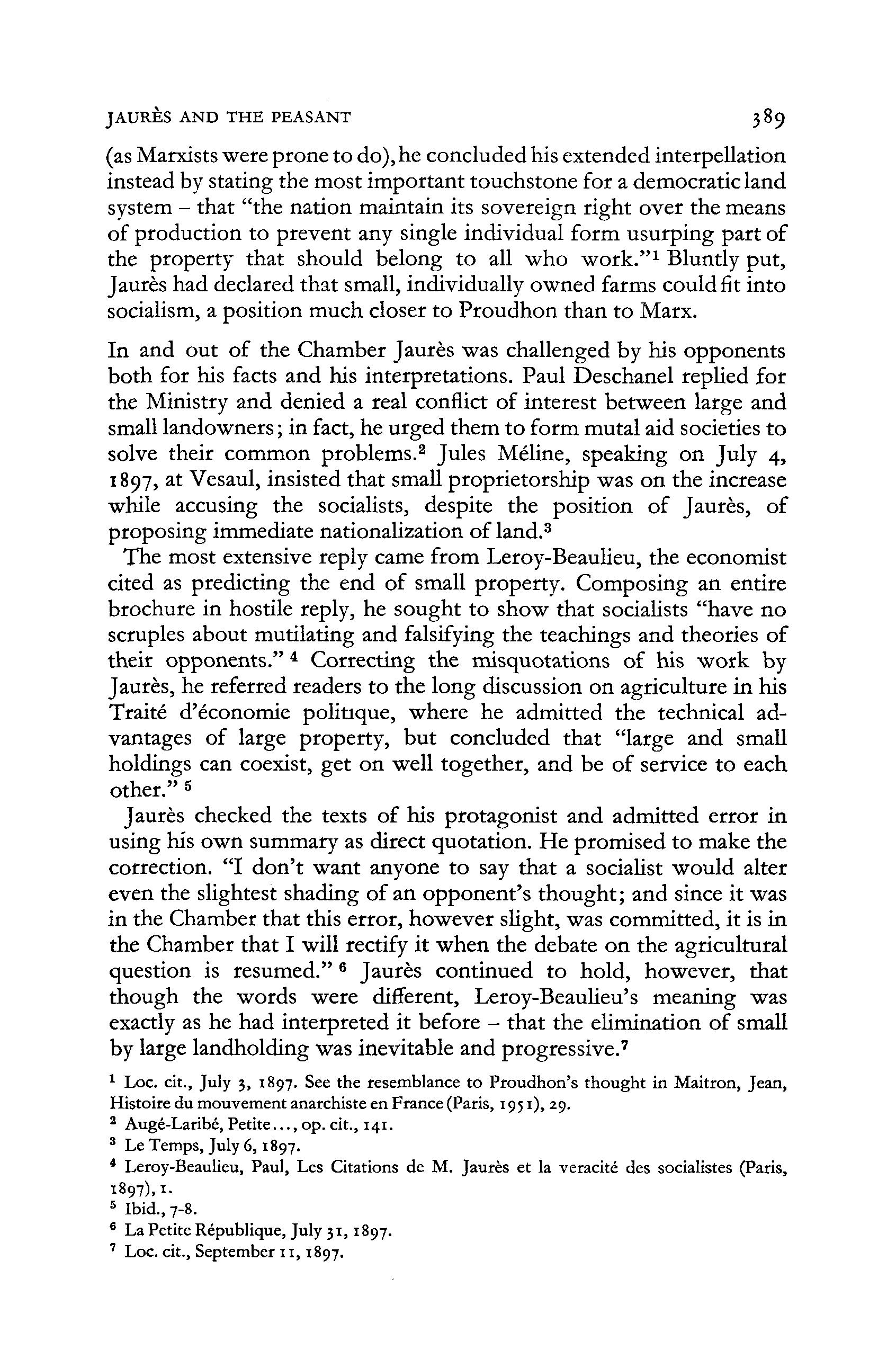 Jaures checked the texts of his protagonist and admitted error in using his own summary as direct quotation. He promised t o make the correction. " I don' t want anyone t o say that a socialist would alter even the slightest shading of an opponent's thought ; and since it was in the Chamber that this error, however slight, was committed, it is in the Chamber that I will rectify it when the debate on the agricultural question is resumed." 6 Jaures continued t o hold, however, that though the words were different, Leroy-Beaulieu's meaning was exactly as he had interpreted it before - that the elimination of small by large landholding was inevitable and progressive.7