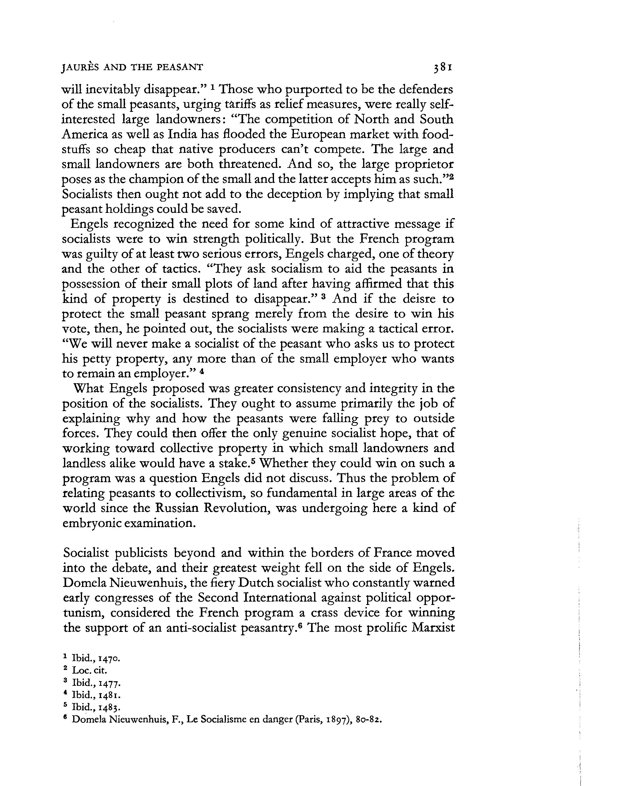 Socialist publicists beyond and within the borders of France moved into the debate, and their greatest weight fell on the side of Engels. Domela Nieuwenhuis, thefieryDutc h socialist wh o constantly warned early congresses of the Second International against political opportunism, considered the French program a crass device for winning the support of an anti-socialist peasantry.6 The most prolific Marxist