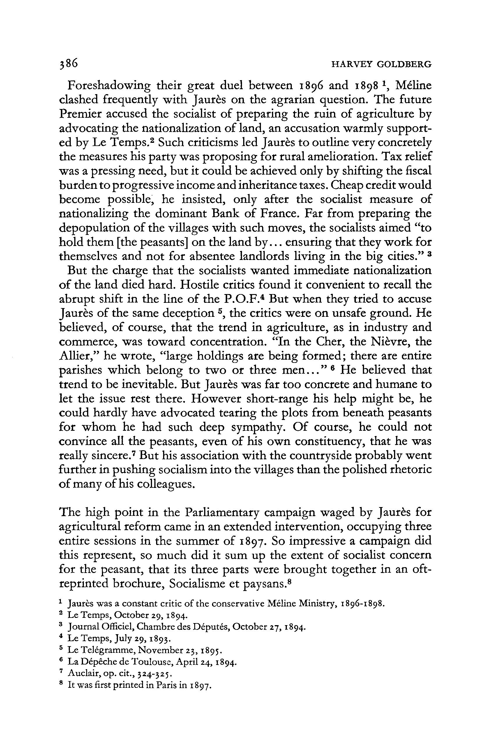 Foreshadowing their great duel between 1896 and 1898 1 , Meline clashed frequently with Jaures on the agrarian question The future Premier accused the socialist of preparing the ruin of agriculture by advocating the nationalization of land, an accusation warmly supported by Le Temps.2 Such criticisms led Jaures t o outline very concretely the measures his party was proposing for rural amelioration. Tax relief was a pressing need, bu t it could be achieved only by shifting the fiscal burden t o progressive income and inheritance taxes. Cheap credit would become possible, he insisted, only after the socialist measure of nationalizing the dominant Bank of France. Far from preparing the depopulation of the villages with such moves, the socialists aimed "t o hold them [the peasants] on the land by.. . ensuring that they wor k for themselves and no t for absentee landlords living in the big cities." 3