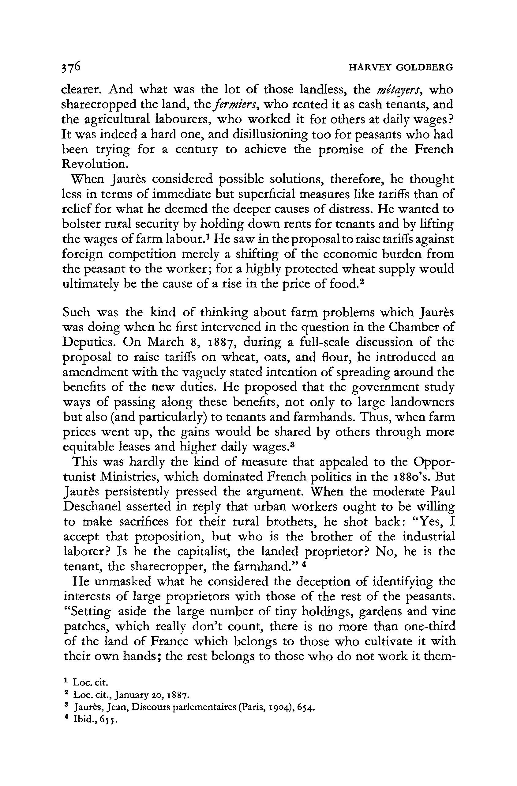 Such was the kind of thinking about farm problems which Jaures was doing when he first intervened in the question in the Chamber of Deputies. On March 8, 1887, during a full-scale discussion of the proposal t o raise tariffs on wheat, oats, and flour, he introduced an amendment with the vaguely stated intention of spreading around the benefits of the new duties. He proposed that the government study ways of passing along these benefits, not only t o large landowners bu t also (and particularly) t o tenants and farmhands. Thus, when farm prices went up , the gains would be shared by others through more equitable leases and higher daily wages. 3