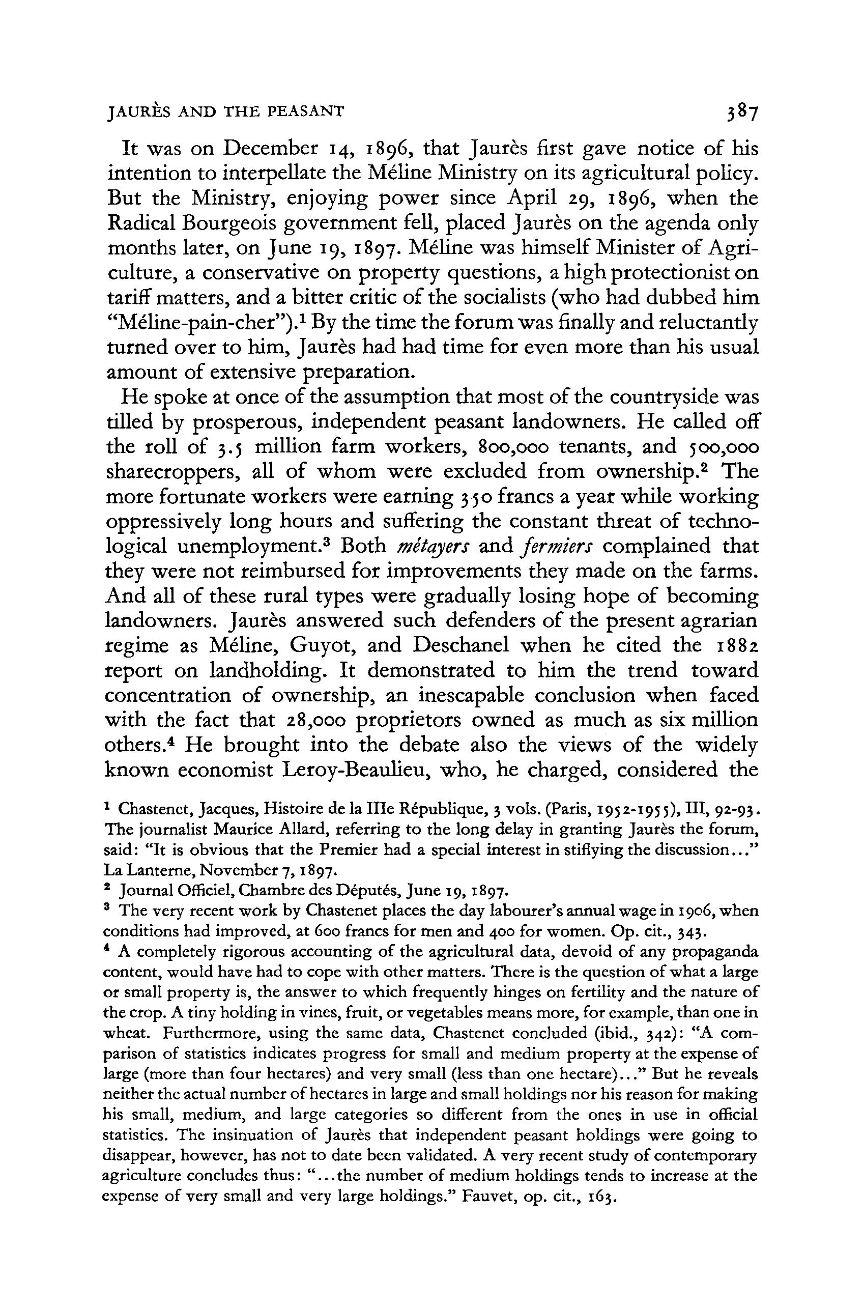 He spoke at once of the assumption that most of the countryside was tilled by prosperous, independent peasant landowners He called off the roll of 3.5 million farm workers, 800,000 tenants, and 500,000 sharecroppers, all of whom were excluded from ownership.2 Th e more fortunate workers were earning 350 francs a year while working oppressively long hours and suffering the constant threat of technological unemployment.3 Both metayers and fermiers complained that they were not reimbursed for improvements they made on the farms. And all of these rural types were gradually losing hope of becoming landowners. Jaures answered such defenders of the present agrarian regime as Meline, Guyot, and Deschanel when he cited the 1882 report on landholding. I t demonstrated t o him the trend toward concentration of ownership, an inescapable conclusion when faced with the fact that 28,000 proprietors owned as much as six million others.4 He brough t int o the debate also the views of the widely known economist Leroy-Beaulieu, who , he charged, considered the