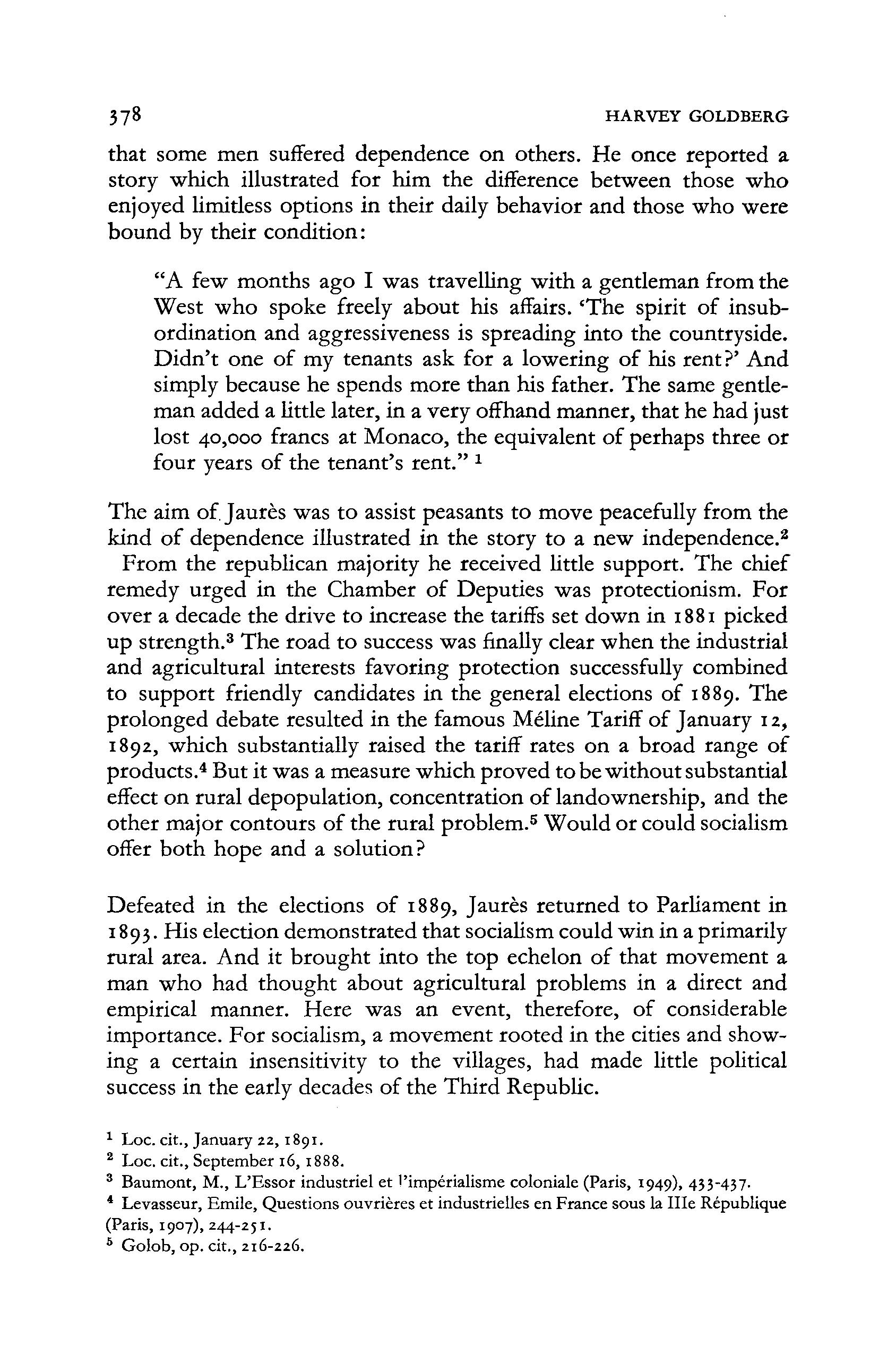 The aim of. Jaures was t o assist peasants t o move peacefully from the kind of dependence illustrated in the story t o a new independence.2 From the republican majority he received little support. The chief remedy urged in the Chamber of Deputies was protectionism. For over a decade the drive t o increase the tariffs set down in 1881 picked up strength.3 The road t o success was finally clear when the industrial and agricultural interests favoring protection successfully combined t o support friendly candidates in the general elections of 1889. The prolonged debate resulted in the famous Meline Tariff of January 12, 1892, which substantially raised the tariff rates on a broad range of products.4 But it was a measure which proved t o be without substantial effect on rural depopulation, concentration of landownership, and the other major contours of the rural problem.5 Would or could socialism offer bot h hope and a solution?