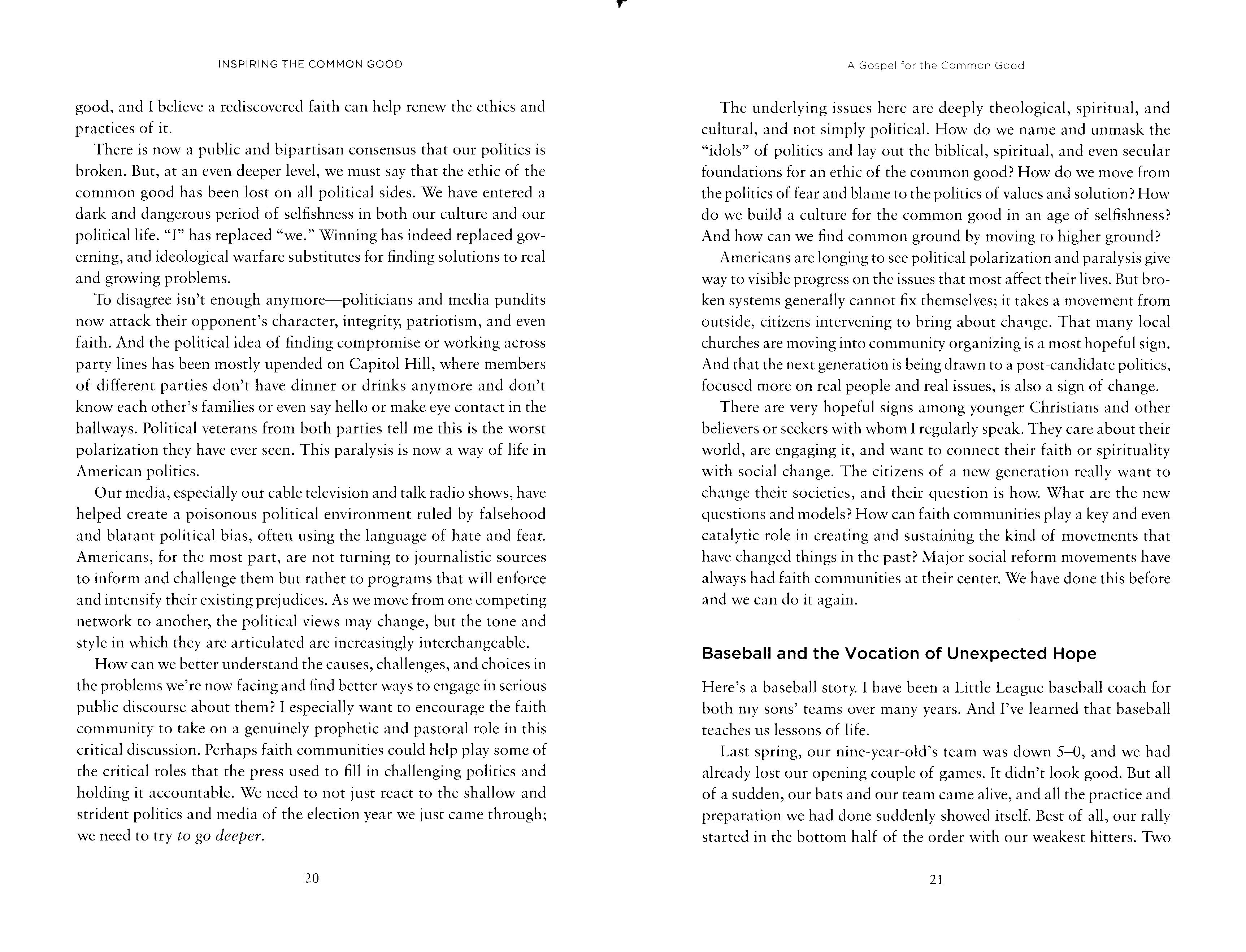 Rereading C. S. Lewis's Chronicles of Narnia while on retreat set the tone for my sabbatical. The more I focused on what "a gospel for the common good" would look like, the more I saw how foreign an idea it is in our politics today. Watching politics for the first three months of an election year, but not engaging in it, showed me how depressing (a strong but accurate word) our political discourse has become-on all sides. This hook attempts a response to that discourse-trying to lift up the common good, a new civil discourse, and the hope for common ground on important issues, even among people who vote differently.