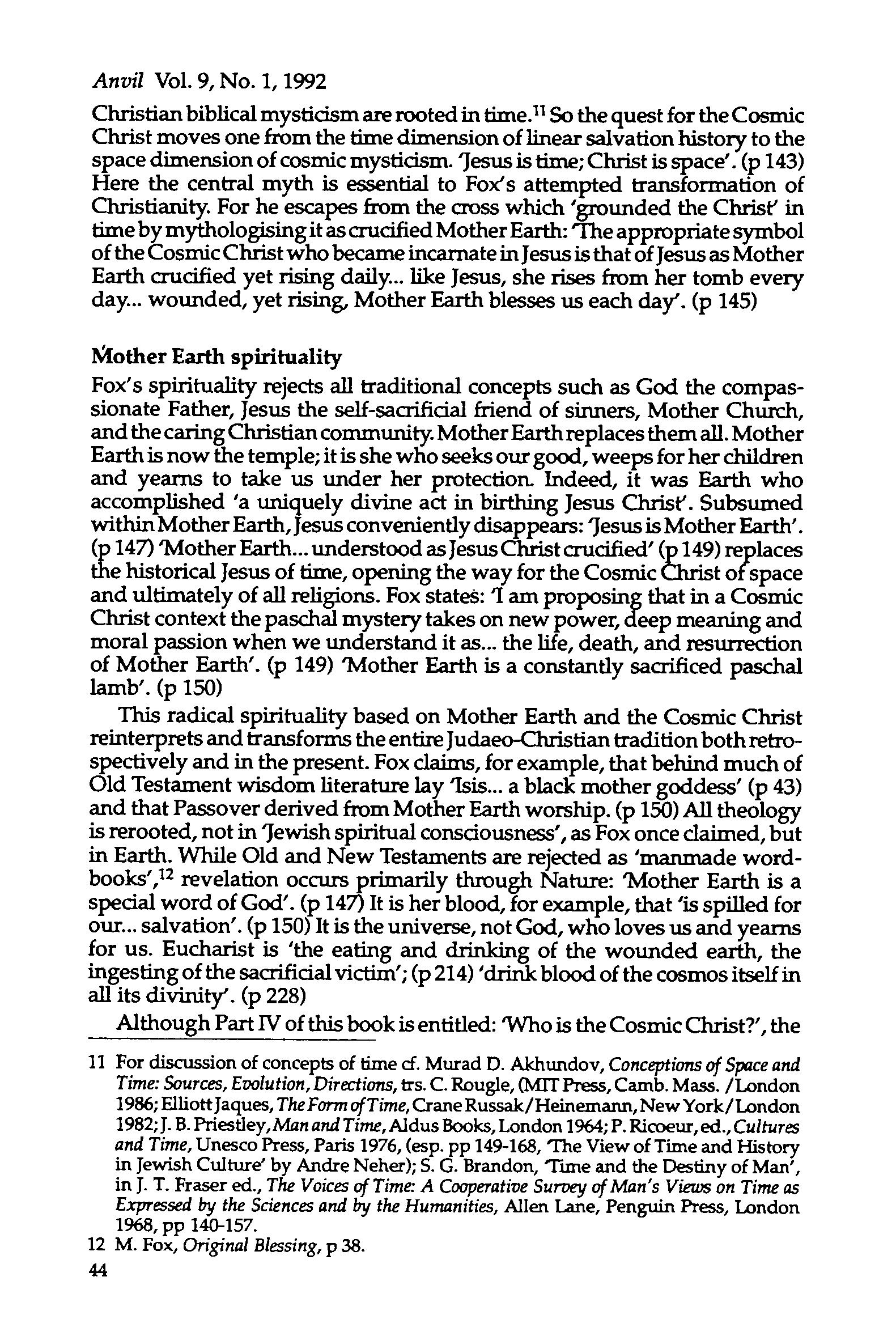 Christian biblical mysticism are rooted in time. 11 So the quest for the Cosmic Christ moves one from the time dimension of linear salvation history to the space dimension of cosmic mysticism. 'Jesus is time; Christ is space'. (p 143) Here the central myth is essential to Fox's attempted transformation of Christianity. For he escapes from the cross which 'grounded the Christ' in time by mythologising it as crucified Mother Earth: 'The appropriate symbol of the Cosmic Christ who became incarnate in Jesus is that of Jesus as Mother Earth crucified yet rising daily... like Jesus, she rises from her tomb every day... wounded, yet rising, Mother Earth blesses us each day'. (p 145)
