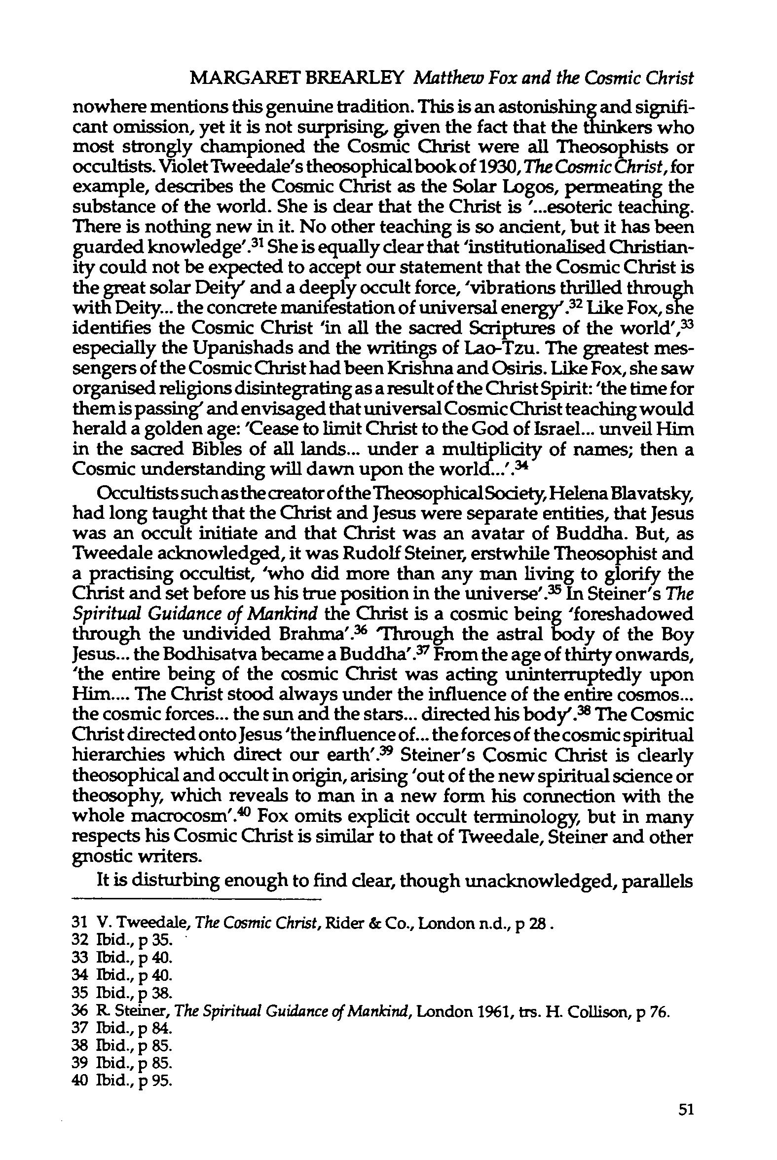 Occultists such as the creator of the Theosophical Society, Helena Blavatsky, had long taught that the Christ and Jesus were separate entities, that Jesus was an occult initiate and that Christ was an avatar of Buddha. But, as Tweedale acknowledged, it was Rudolf Steiner, erstwhile Theosophist and a practising occultist, 'who did more than any man living to glorify the Christ and set before us his true position in the universe'.35 In Steiner's The Spiritual Guidance of Mankind the Christ is a cosmic being 'foreshadowed through the undivided Brahma'.36 'Through the astral body of the Boy Jesus the Bodhisatva became a Buddha' .'SI From the age of thirty onwards, 'the entire being of the cosmic Christ was acting uninterruptedly upon Him The Christ stood always under the influence of the entire cosmos the cosmic forces the sun and the stars directed his body'.38 The Cosmic Christ directed onto Jesus 'the influence of... the forces of the cosmic spiritual hierarchies which direct our earth'.39 Steiner's Cosmic Christ is clearly theosophical and occult in origin, arising 'out of the new spiritual science or theosophy, which reveals to man in a new form his connection with the whole macrocosm'.40 Fox omits explicit occult terminology, but in many respects his Cosmic Christ is similar to that of Tweedale, Steiner and other gnostic writers.