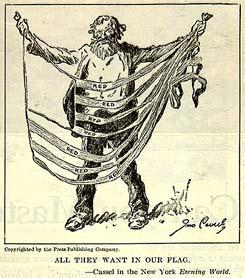 Image 1.3, the last of these images, was created by the political cartoon artist Cassel and published on January 24, 1920 as “All They Want in Our Flag.” An interesting note about this piece is that its publisher, New York Evening World, was notorious for its sensationalism and was at one time owned by Joseph Pulitzer, the famed “yellow journalist” (Juergens, 43-44); this information may help to place the melodramatic nature of this cartoon into context.