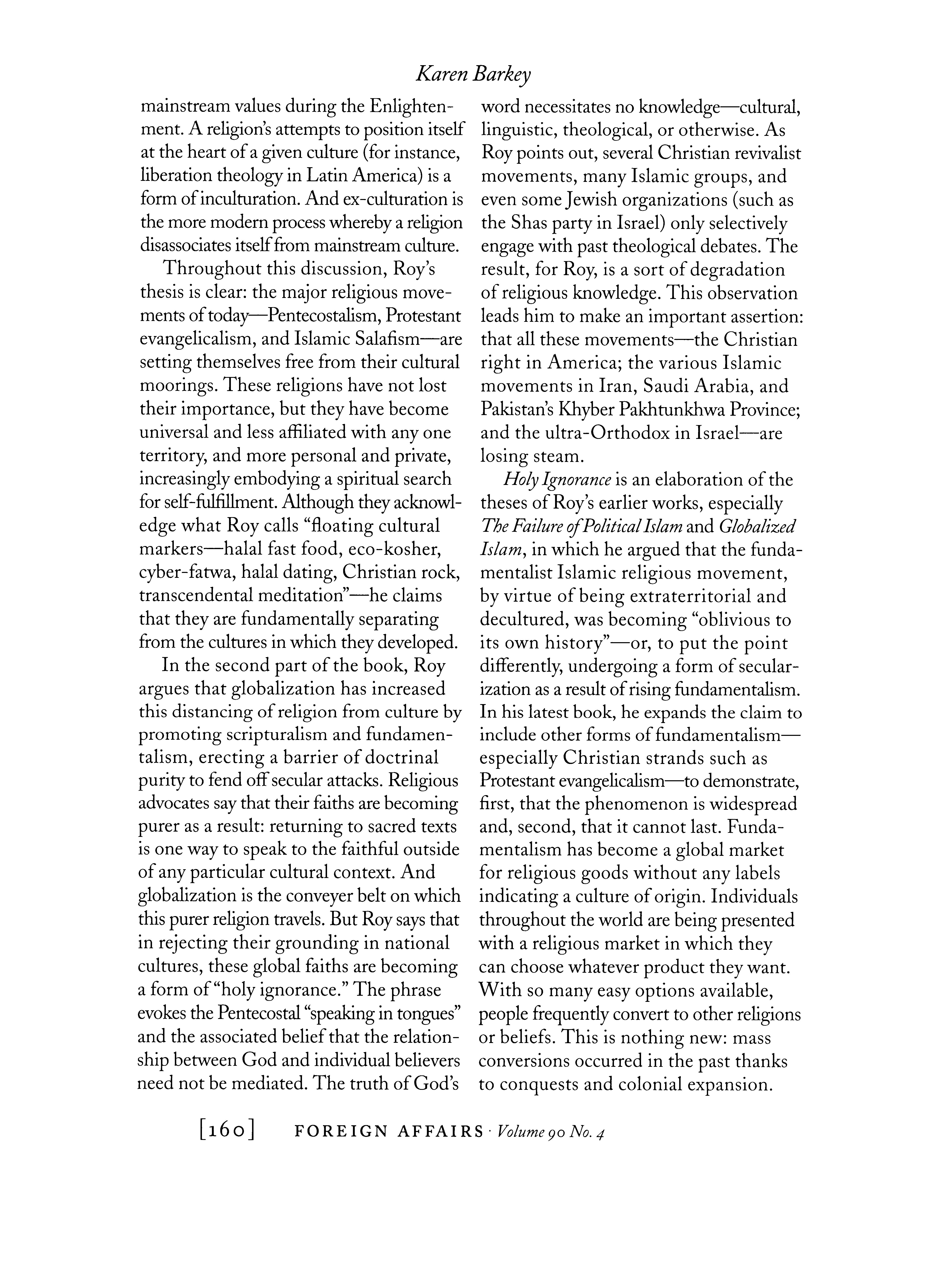 dissociated, religious fundamentalism may increasingly penetrate societies and erode their secular and democratic practices. Like many other books about religion and modernity, Holy Ignorance describes a myriad different new religious movements—Protestant evangelicalism, Haredi Judaism, Islamic Salafism— against the backdrop of secularizing soci eties, highlighting the changing relations between culture and religion as global ization intensifies. In the first part of his book, Roy displays an impressive grasp of the innumerable permutations in these re lations over history's long arc. He organizes the variations into four broad categories: deculturation, acculturation, inculturation, and ex-culturation. Deculturation occurs when religion tries to eradicate paganism (as European Christianity did in North America and orthodox Islam did on the Indian subcontinent). The best example of acculturation is the Jews' adoption of