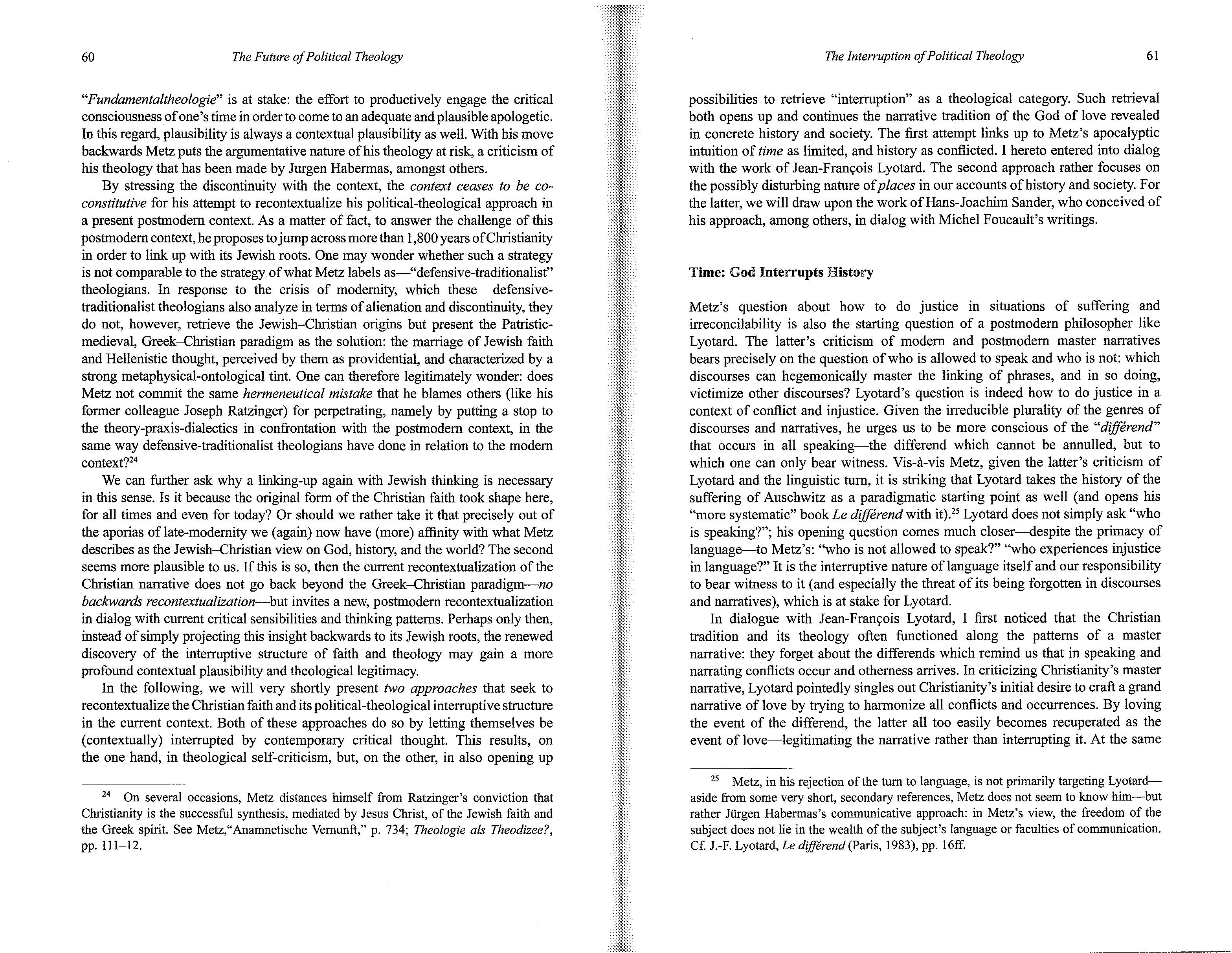 possibilities to retrieve "interruption" as a theological category. Such retrieval both opens up and continues the narrative tradition of the God of love revealed in concrete history and society. The first attempt links up to Metz's apocalyptic intuition of time as limited, and history as conflicted. I hereto entered into dialog with the work of Jean-Fran9ois Lyotard. The second approach rather focuses on the possibly disturbing nature of places in our accounts of history and society. For the latter, we will draw upon the work ofHans-Joachim Sander, who conceived of his approach, among others, in dialog with Michel Foucault's writings.