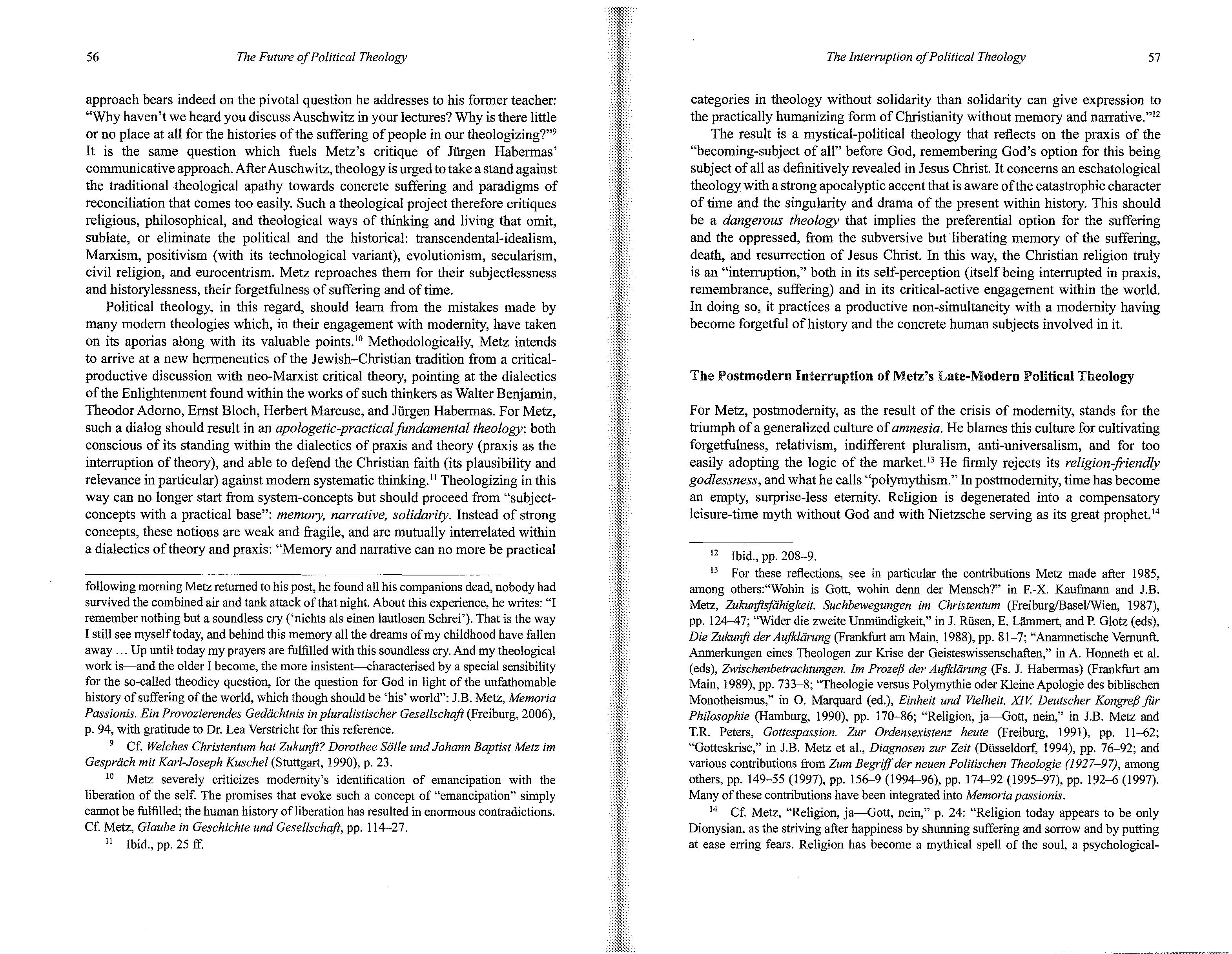 13 For these reflections, see in particular the contributions Metz made after 1985, among others:"Wohin is Gott, wohin denn der Mensch?" in F.-X. Kaufinann and J.B. Metz, Zukunftsfahigkeit. Suchbewegungen im Christentum (Freiburg!Basel!Wien, 1987), pp. 124-47; "Wider die zweite Unmtindigkeit," in J. Rtisen, E. Lammert, and P. Glotz (eds), Die Zukunft der Aujklarung (Frankfurt am Main, 1988), pp. 81-7; "Ananmetische Vernunft. Anmerkungen eines Theologen zur Krise der Geisteswissenschaften," in A. Honneth et a!. (eds), Zwischenbetrachtungen. Im ProzefJ der Aujklarung (Fs. J. Habermas) (Frankfurt am Main, 1989), pp. 733-8; "Theologie versus Polymythie oder Kleine Apologie des biblischen Monotheismus," in 0. Marquard (ed.), Einheit und Vielheit. XIV. Deutscher KongrefJ for Philosophie (Hamburg, 1990), pp. 170-86; "Religion, ja-Gott, nein," in J.B. Metz and T.R. Peters, Gottespassion. Zur Ordensexistenz heute (Freiburg, 1991), pp. 11-62; "Gotteskrise," in J.B. Metz eta!., Diagnosen zur Zeit (DUsseldorf, 1994), pp. 76-92; and various contributions from Zum Begriff der neuen Politischen Theologie (1927-97), among others, pp. 149-55 (1997), pp. 156-9 (1994-96), pp. 174-92 (1995-97), pp. 192-6 (1997). Many of these contributions have been integrated into Memoria passionis.