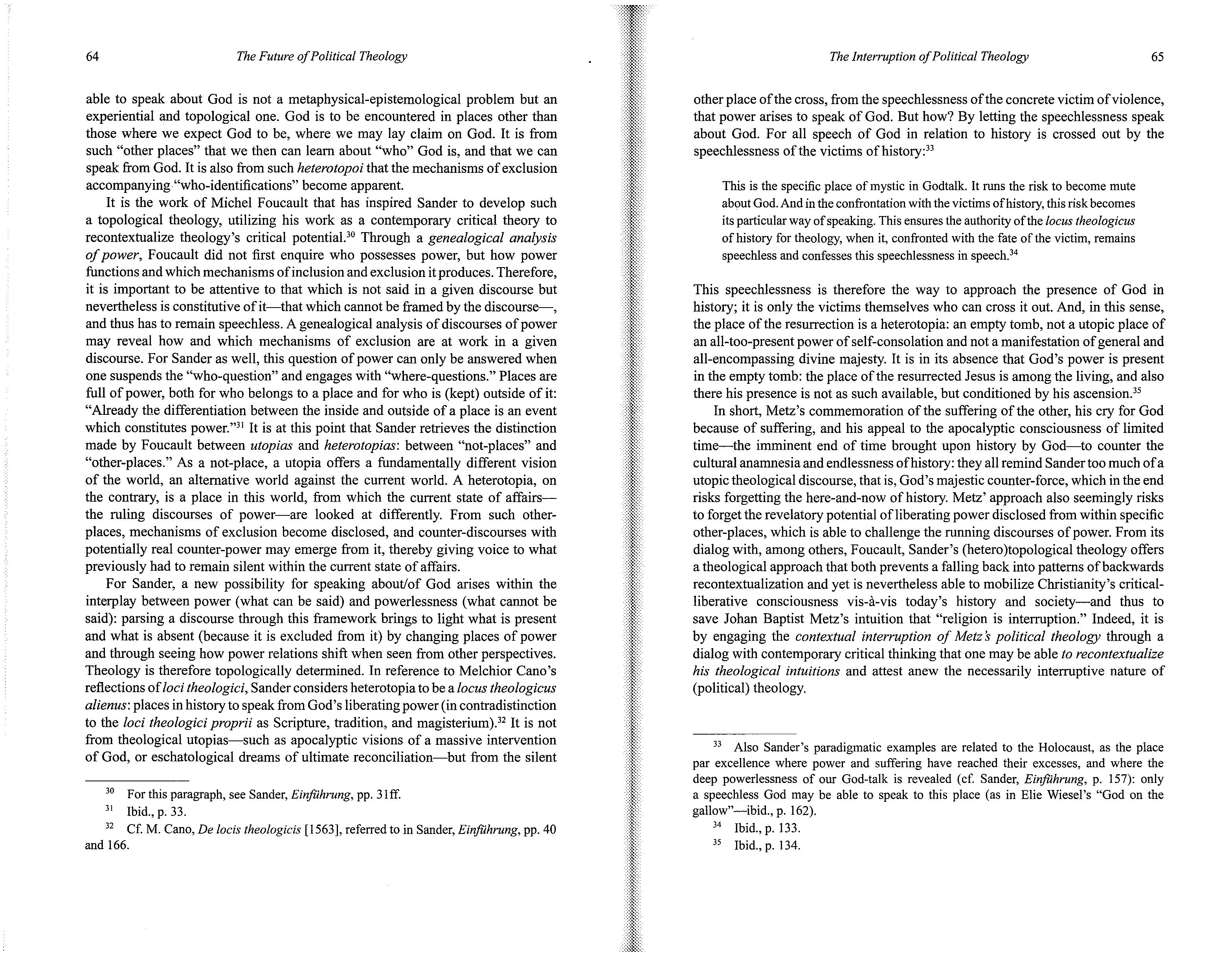 In short, Metz's commemoration of the suffering of the other, his cry for God because of suffering, and his appeal to the apocalyptic consciousness of limited time-the imminent end of time brought upon history by God-to counter the cultural anamnesia and endlessness ofhistory: they all remind Sander too much of a utopic theological discourse, that is, God's majestic counter-force, which in the end risks forgetting the here-and-now of history. Metz' approach also seemingly risks to forget the revelatory potential ofliberating power disclosed from within specific other-places, which is able to challenge the running discourses of power. From its dialog with, among others, Foucault, Sander's (hetero)topological theology offers a theological approach that both prevents a falling back into patterns of backwards recontextualization and yet is nevertheless able to mobilize Christianity's criticalliberative consciousness vis-a-vis today's history and society-and thus to save Johan Baptist Metz's intuition that "religion is interruption." Indeed, it is by engaging the contextual interruption of Metz 's political theology through a dialog with contemporary critical thinking that one may be able to recontextualize his theological intuitions and attest anew the necessarily interruptive nature of (political) theology.