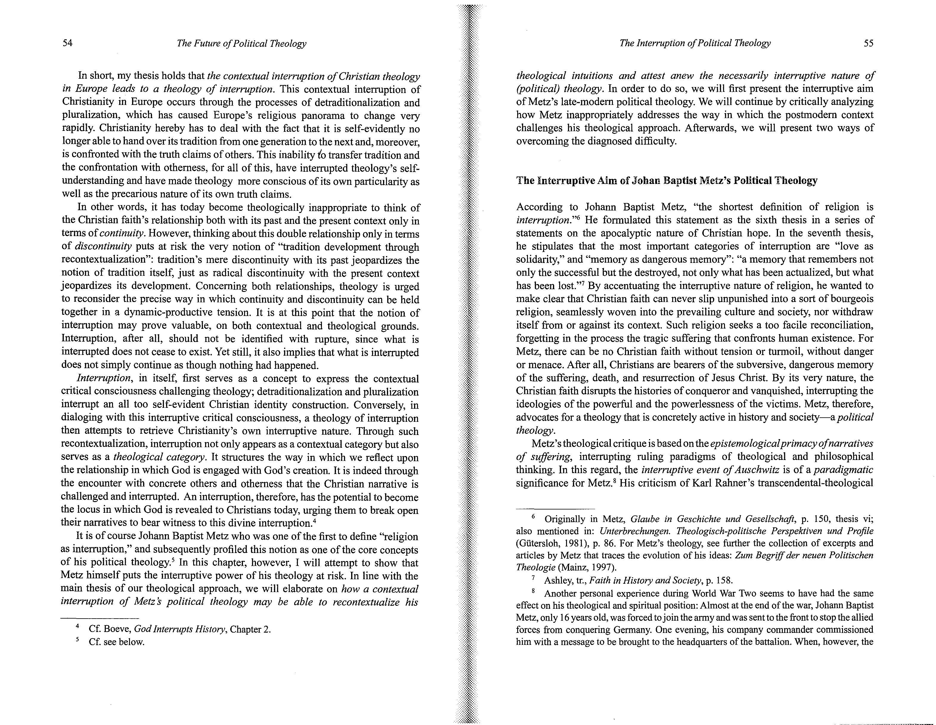 It is of course Johann Baptist Metz who was one of the first to define "religion as interruption," and subsequently profiled this notion as one of the core concepts of his political theology. 5 In this chapter, however, I will attempt to show that Metz himself puts the interruptive power of his theology at risk. In line with the main thesis of our theological approach, we will elaborate on how a contextual interruption of Metz s political theology may be able to recontextualize his