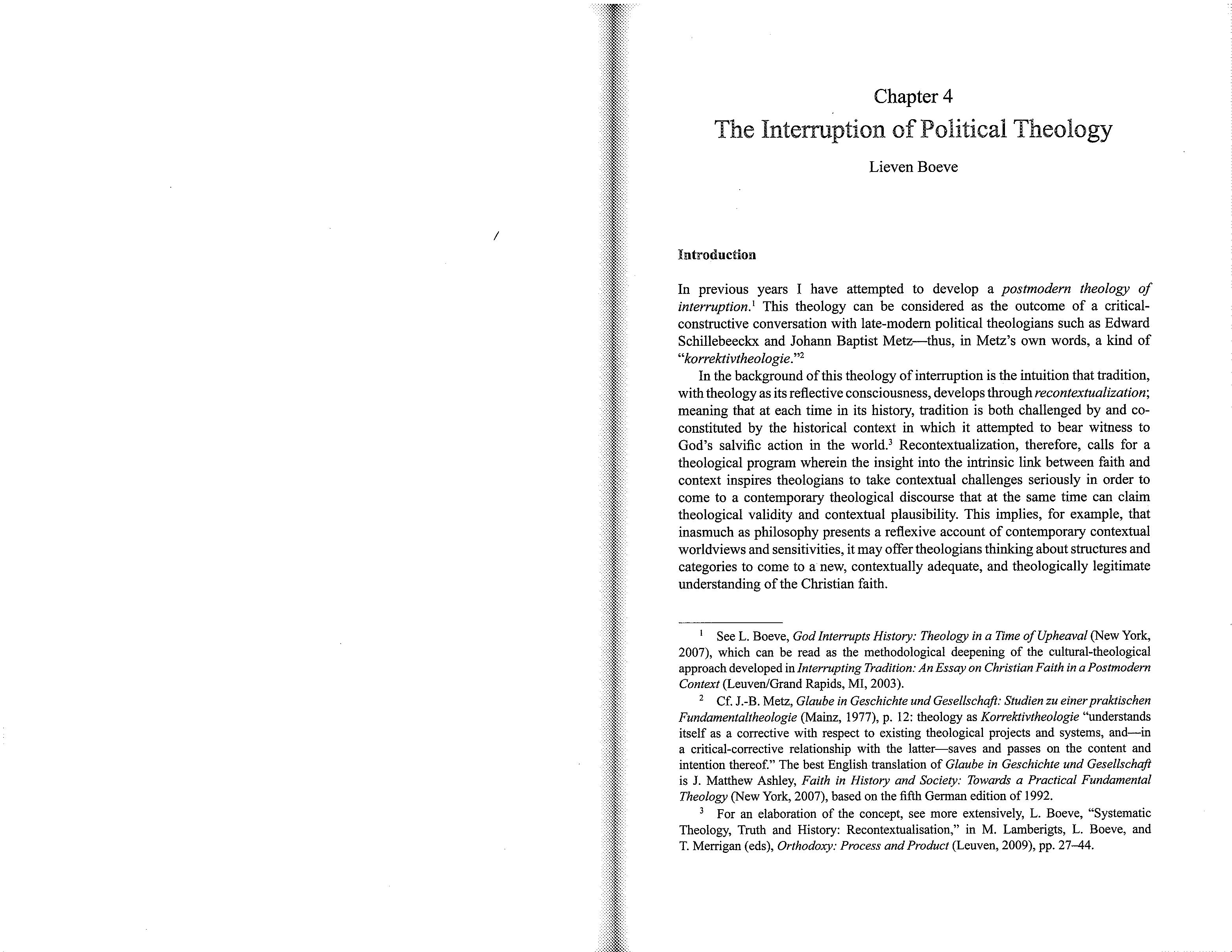 I See L. Boeve, God Interrupts History: Theology in a Time of Upheaval (New York, 2007), which can be read as the methodological deepening of the cultural-theological approach developed in Interrupting Tradition: An Essay on Christian Faith in a Postmodern Context (Leuven!Grand Rapids, MI, 2003).
