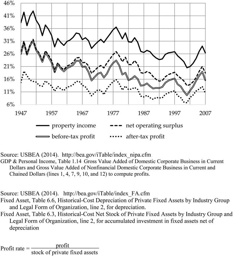 Figure1.Eachexpressescorporations’profitsasapercentageoftheir accumulatedinvestmentin(or“netstockof”)fixedassets.Bothprofit andaccumulatedinvestmentaremeasurednetofdepreciationasvaluedathistoricalcost.ThemostinclusivemeasureofprofitiswhatIcall “propertyincome,”grossvalueaddedminusdepreciationandcompensationofemployees.Netoperatingsurplusexcludes,inaddition,net