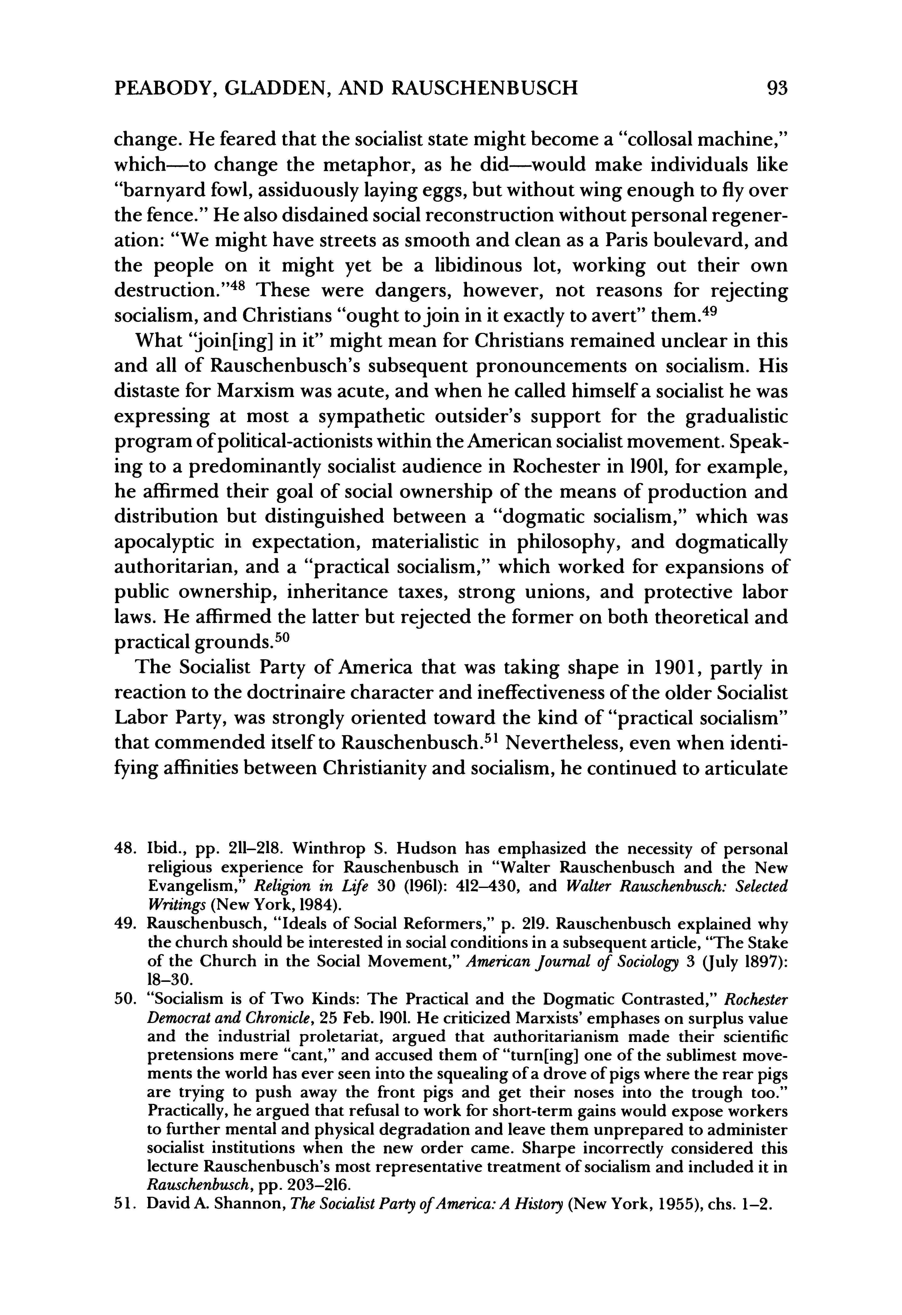 50. "Socialism is of Two Kinds: The Practical and the Dogmatic Contrasted," Rochester Democratand Chronicle,25 Feb. 1901.He criticized Marxists' emphases on surplus value and the industrial proletariat, argued that authoritarianism made their scientific pretensions mere "cant," and accused them of "turn[ing] one of the sublimest movements the world has ever seen into the squealing of a drove of pigs where the rear pigs are trying to push away the front pigs and get their noses into the trough too." Practically, he argued that refusal to work for short-term gains would expose workers to further mental and physical degradation and leave them unprepared to administer socialist institutions when the new order came. Sharpe incorrectly considered this lecture Rauschenbusch's most representative treatment of socialism and included it in Rauschenbusch,pp. 203-216.