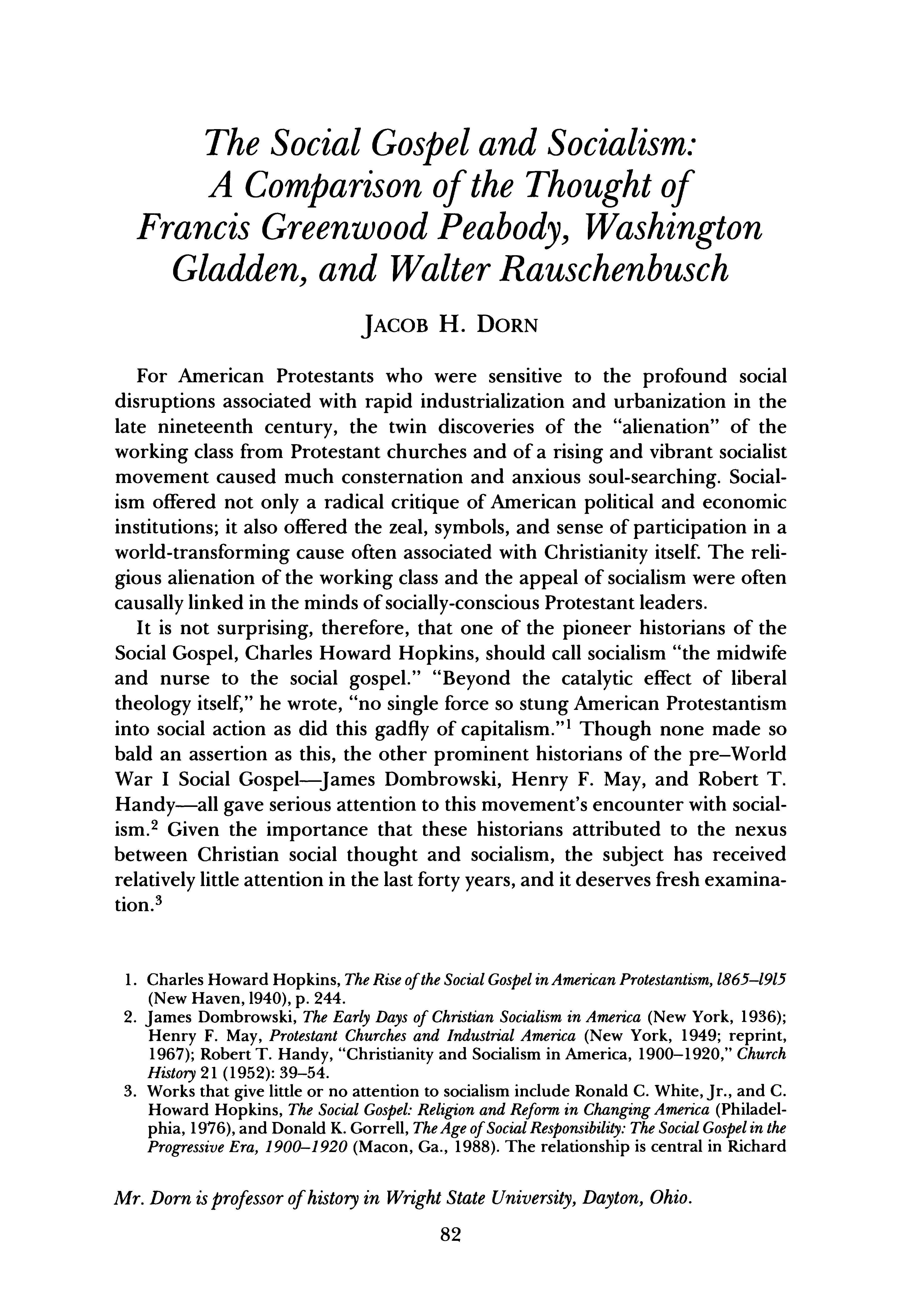 It is not surprising, therefore, that one of the pioneer historians of the Social Gospel, Charles Howard Hopkins, should call socialism "the midwife and nurse to the social gospel." "Beyond the catalytic effect of liberal theology itself," he wrote, "no single force so stung American Protestantism into social action as did this gadfly of capitalism."' Though none made so bald an assertion as this, the other prominent historians of the pre-World War I Social Gospel-James Dombrowski, Henry F. May, and Robert T. Handy-all gave serious attention to this movement's encounter with socialism.2 Given the importance that these historians attributed to the nexus between Christian social thought and socialism, the subject has received relatively little attention in the last forty years, and it deserves fresh examination.3