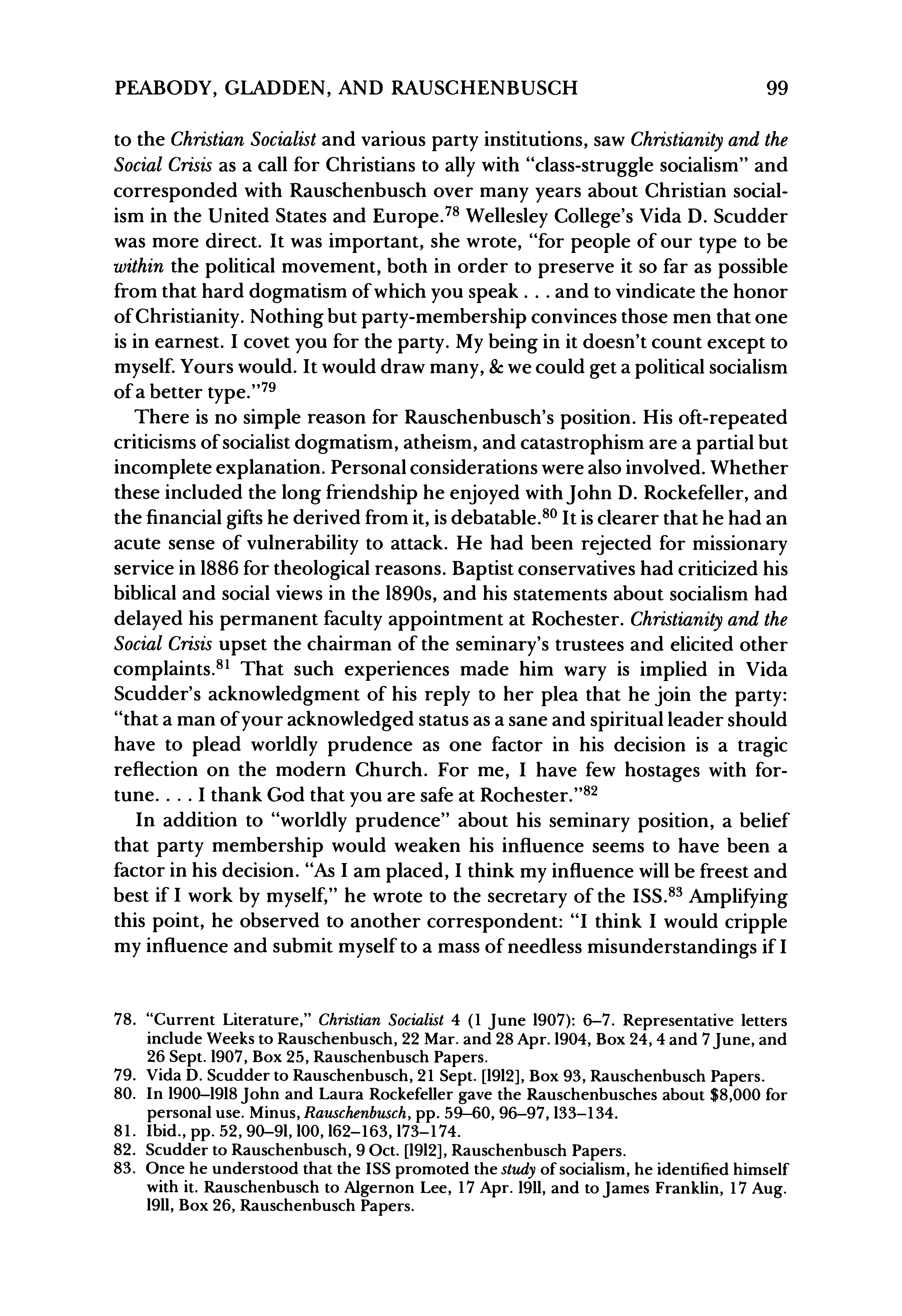 There is no simple reason for Rauschenbusch'sposition. His oft-repeated criticismsof socialistdogmatism, atheism,and catastrophismareapartialbut incomplete explanation. Personalconsiderationswerealsoinvolved.Whether these included the long friendship he enjoyed withJohn D. Rockefeller,and the financialgiftshe derived fromit,isdebatable.80Itisclearerthathe had an acute sense of vulnerability to attack. He had been rejected for missionary servicein 1886fortheological reasons. Baptistconservativeshadcriticizedhis biblicaland socialviewsin the 1890s,and his statements about socialismhad delayed his permanent facultyappointment at Rochester. Christianityandthe SocialCrisisupset the chairman of the seminary'strustees and elicited other complaints.81That such experiences made him wary is implied in Vida Scudder's acknowledgment of his reply to her plea that he join the party: "thatamanofyouracknowledged statusasasaneand spiritualleader should have to plead worldly prudence as one factor in his decision is a tragic reflection on the modern Church. For me, I have few hostages with fortune.... I thankGod thatyou are safeatRochester."82