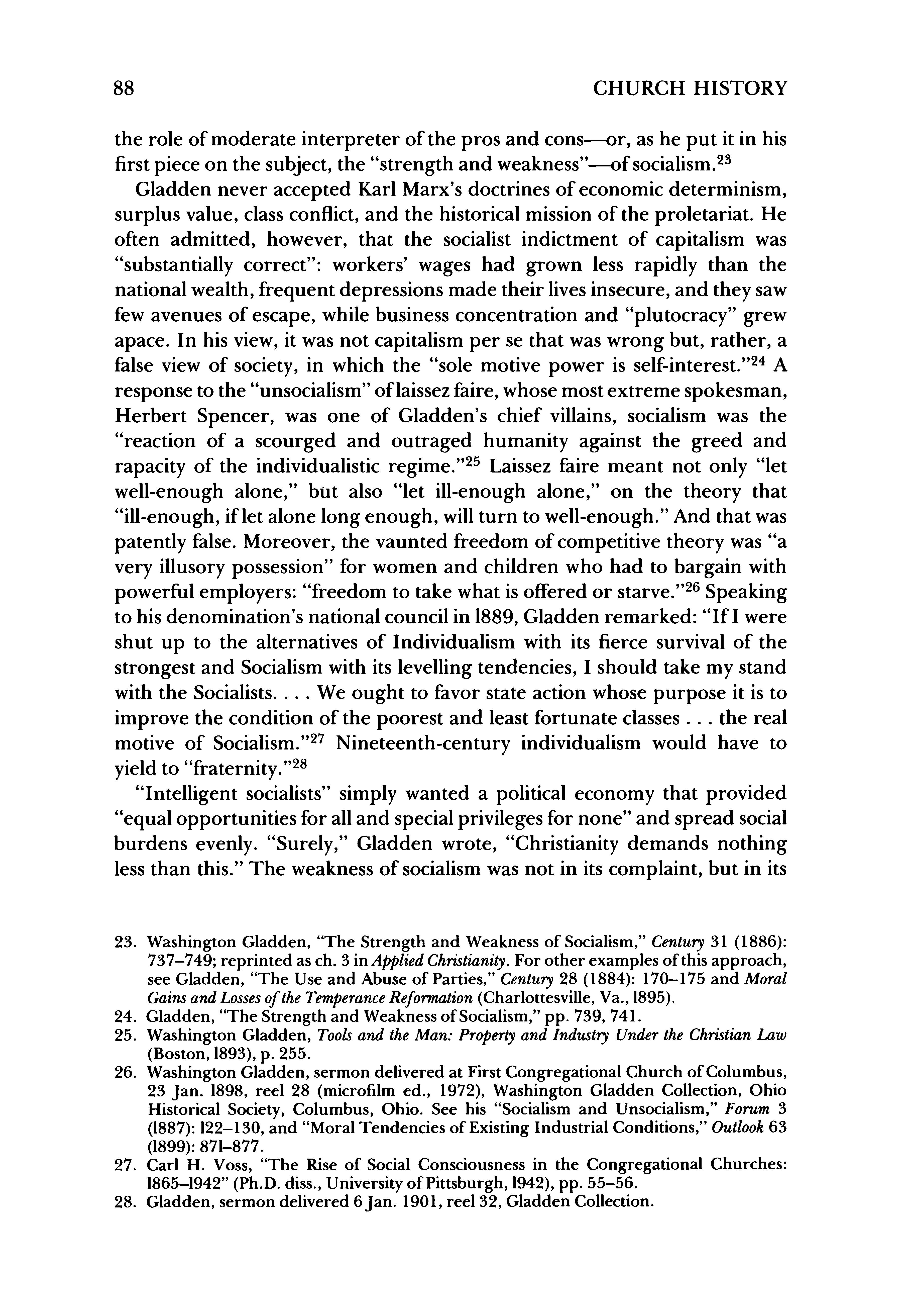 26. Washington Gladden, sermon delivered at First Congregational Church of Columbus, 23 Jan. 1898, reel 28 (microfilm ed., 1972), Washington Gladden Collection, Ohio Historical Society, Columbus, Ohio. See his "Socialism and Unsocialism," Forum 3 (1887):122-130, and "MoralTendencies of Existing Industrial Conditions," Outlook63 (1899):871-877.