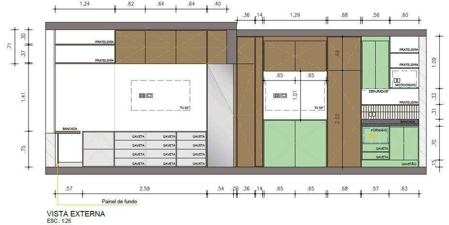 ✔ Parede contínua de marcenaria: Em vez de distribuir armários separados, criamos um único volume de marcenaria planejado , que percorre toda a extensão do ambiente, incluindo: