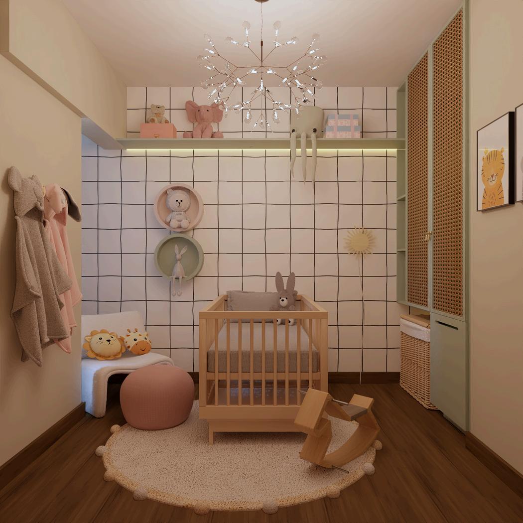 A proposta foi criar um espaço com bichinhos como tema principal, junto a detalhes de palhinha, oferecendo leveza ao ambiente. Além disso, trabalhamos na organização inteligente para otimizar o armazenamento e garantir que tudo fosse prático e funcional para os primeiros anos de vida do bebê.