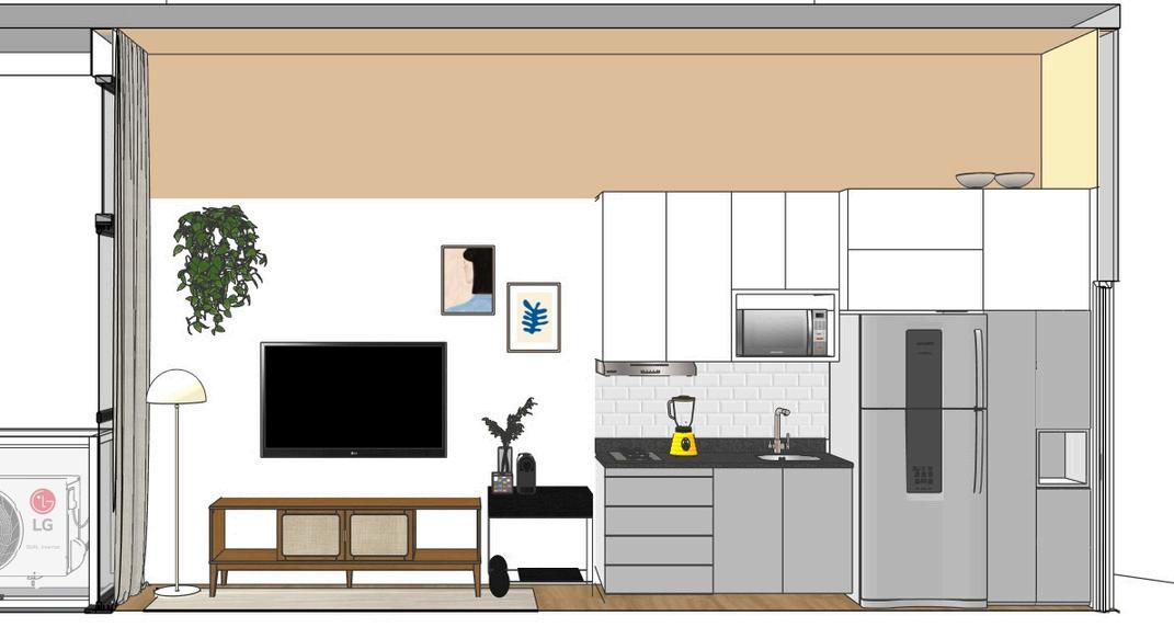 ✔ Divisão inteligente dos ambientes: Na sala/cozinha, instalamos uma porta de funcionamento , permitindo isolar o espaço do quarto quando necessário, sem comprometer a fluidez do ambiente.