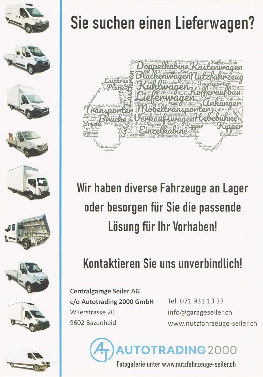 AUF UNS WERDEN IHRE GÜTER ABFAHREN. Inserat TRANSPORT A5 quer | 190 x 128 mm | 10.2023 www.holenstein-transport.ch Ihr Partner für Transport-, Logistik- und Verzollungsdienstleistungen mit Standorten in Wil, Schwarzenbach, Schaffhausen und Konstanz: > 400 Mitarbeitende > 130 Lastwagen > 100‘000 m2 Lagerfläche > 125‘000 Palettenplätze best Quality best Price Industriestrasse 1 9542 Münchwilen Tel. 071 966 48 26 info@maute.ch Direktimport von: weitere Marken auf Anfrage