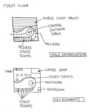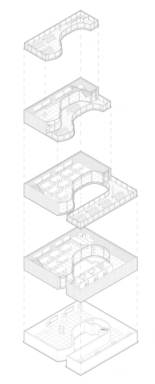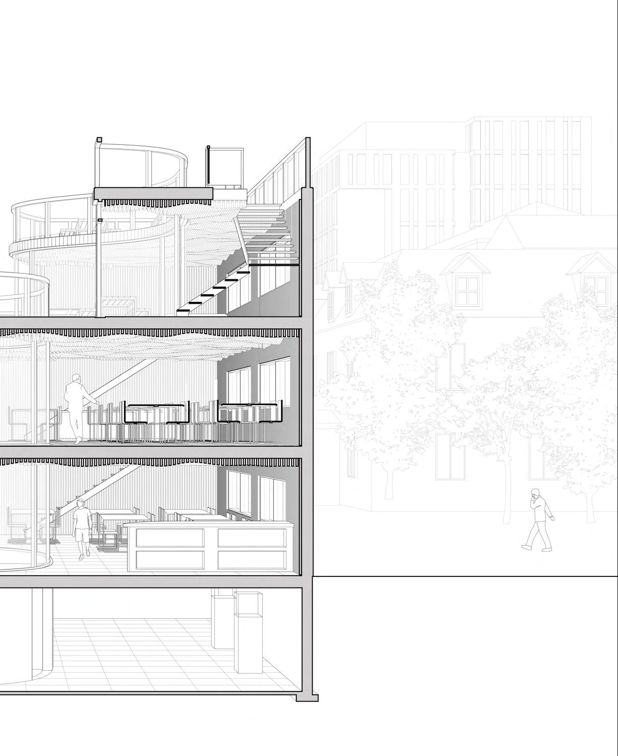This is a semester-long studio project I did on my own during my second year in university. The prompt was to design a study center next to the Goldring Center in Toronto, Ontario. This project was meant to accomodate a plenty of studying spaces, and one extra program of choice, which I decided was going to be an exhibition space. I decided to make the space open, with terrace spaces on top of every floor to maximize space, and indoor spaces that can be used for studying in both a public setting and a private