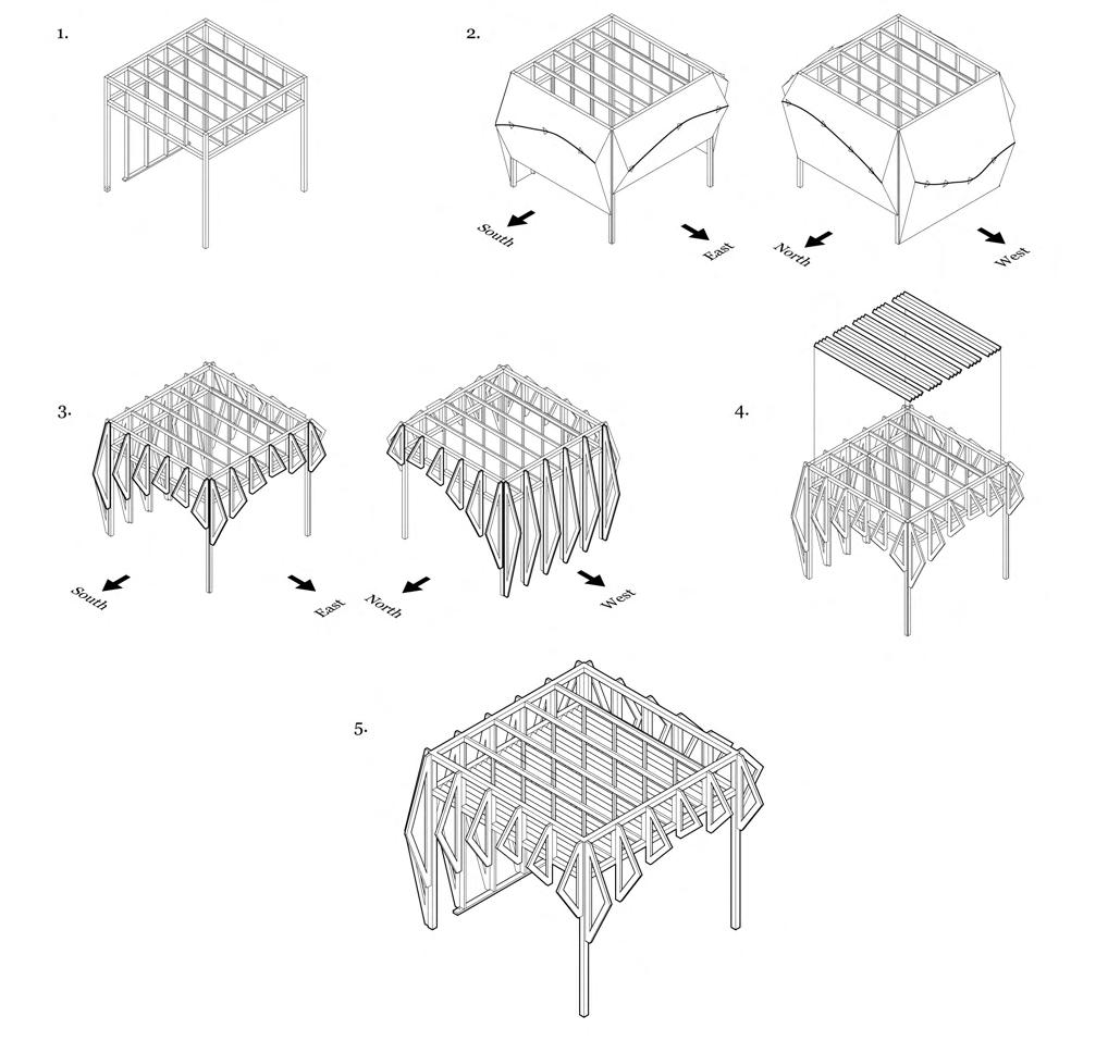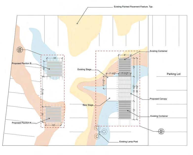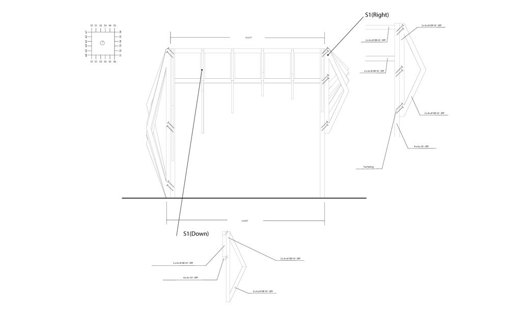For this design, our group decided to go for a simple wavy pattern around the perimeter of our pavillion. This was in coordination with the other groups design for the main stage. Our design had to take everything into consideration: budget, structural stability, shading, aesthetic, and constructability. That is why we used simple structural elements such as as wooden posts and 2X4 joists.