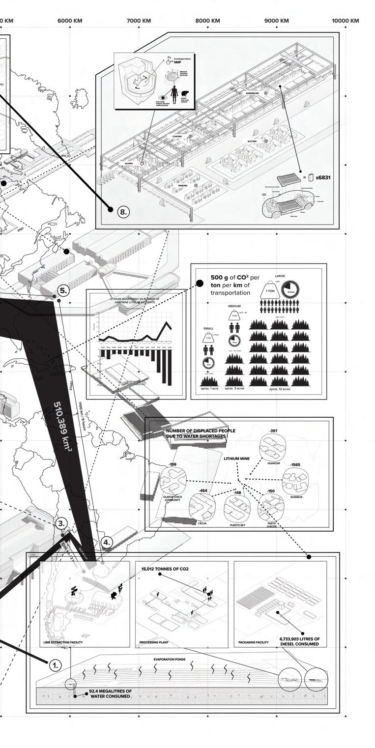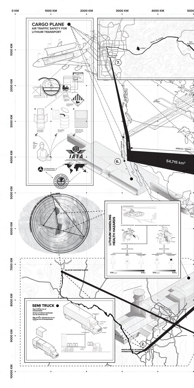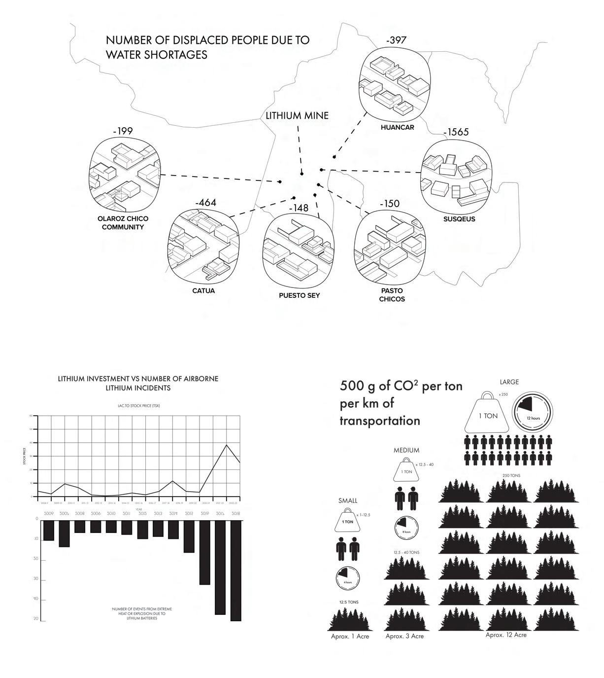 This semester-long studio project aims at discovering the hidden environmental and social impact that the lithium trade complex has on the surrounding inhabitants in Jujuy, Argetina, and on the global gas emissions. In a group of three, my group set out to discover whether electric vehicles are as sustainable as they are promised to be. In specific, our research focused on the scale of environmental impact that mining lithium in Argentina has on it’s indigenous communities, it’s hazardous health consequences, and the cost of it’s itinerary’s carbon footprint. I played a central role in researching the impact on indigenous communities, the immediate health hazards, and the environmental impact of the lithium mine on it’s surroundings.