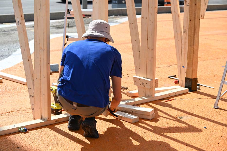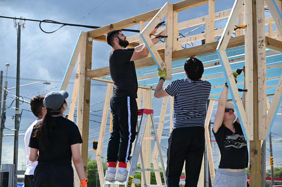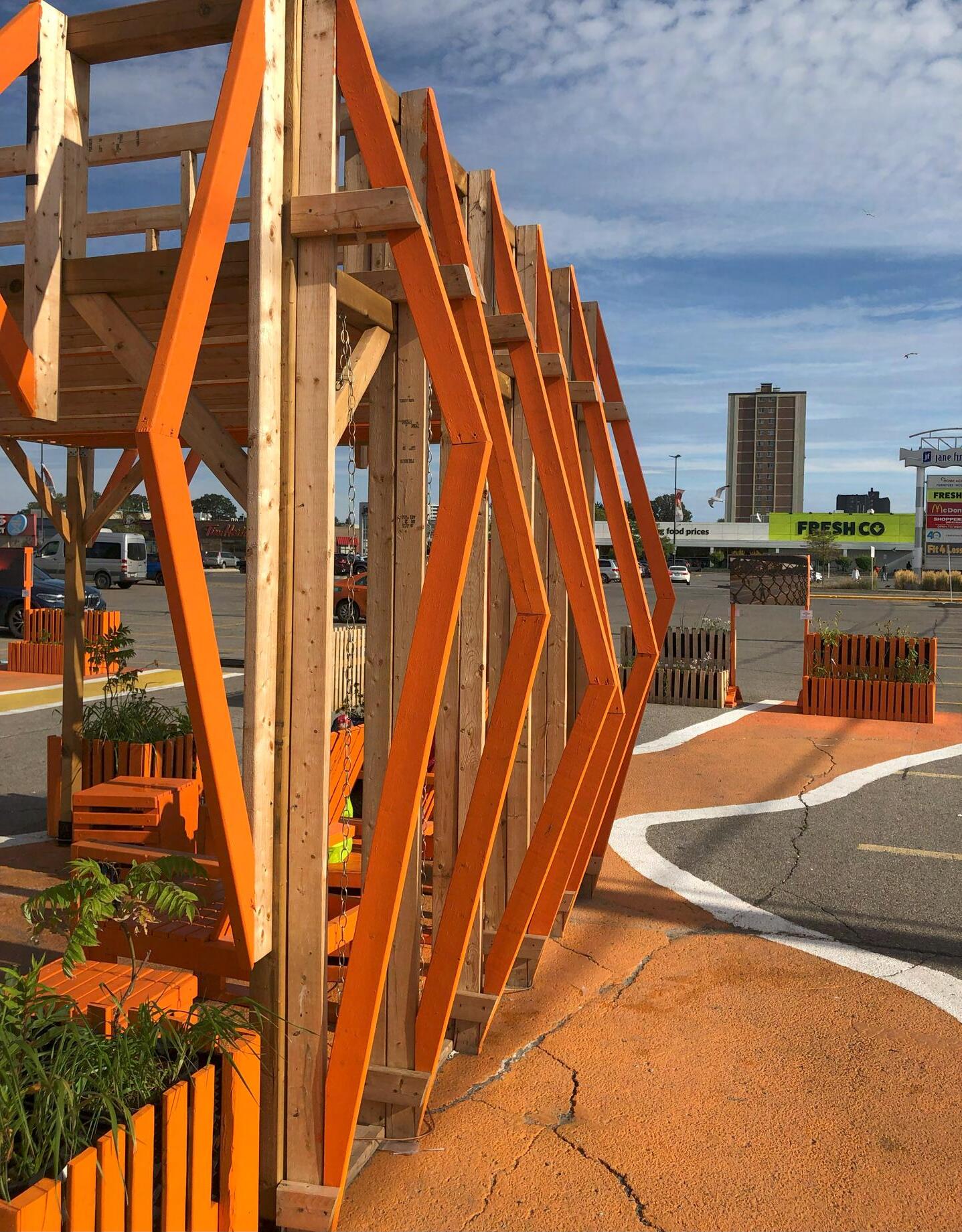 This is a class project I took during the summer of my third year at university. We were tasked with designing and buillding a community space in the parking lot of Jane and Finch mall over the span of two weeks. Our class was split into two groups. One was in charge of designing and building a facade for a stage. The one I was in was in charge of doing the two pavillions in the image on the right. The group I was in had 6 people including myself. My role was to help develop the concept, cut up the wood pieces, and ensure that the building assembly is cohesive.