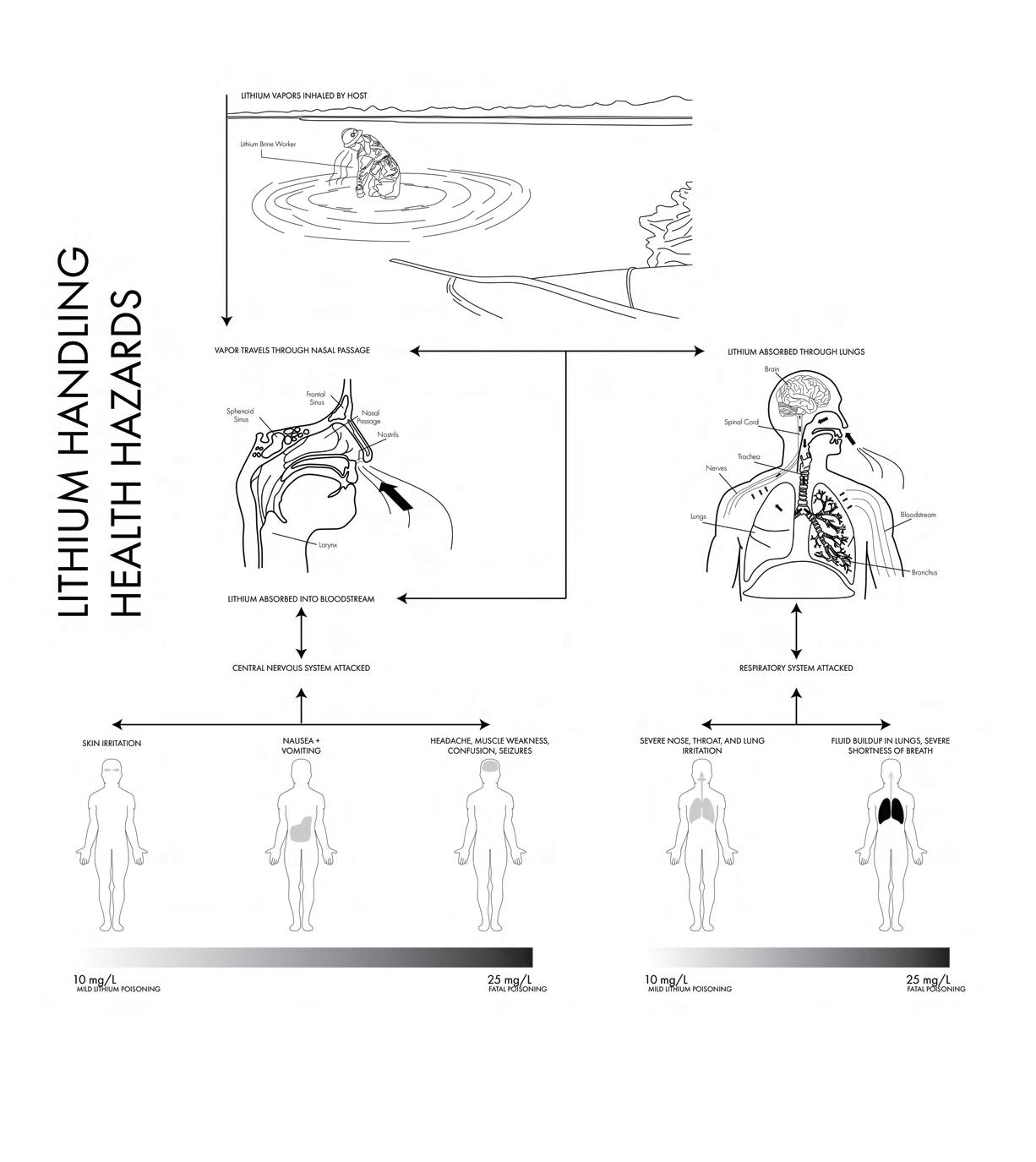 Our research concluded that the process of lithium mining has some devastating immediate consequences to those who involved in the extraction process. The labour involved can often receive some deadly diseases to many vital organs as shown above. The neighbouring communities often are faced with forced displacement in the thousands due to this. Additionally, we found that the lithium mine itself uses a lot of water and oil, leaving a huge carbon footprint, and depleting the area of it;s natural water resources. This severely hinders the chance of survival for any humans or wildlife in the area.