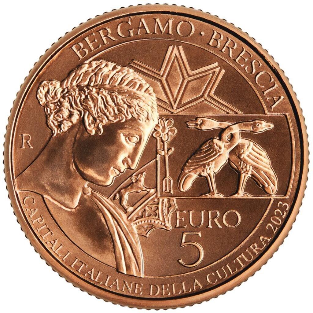 Bergamo og Brescia. Til minde om dette er udgivet denne ganske smukke 5 euro i kobber. Oplaget et 4000 eksemplarer, hvilket er ret lavt for en italiensk mønt. Bagsiden viser forskellige historiske landemærker fra de to byer. Se den inde i bladet.