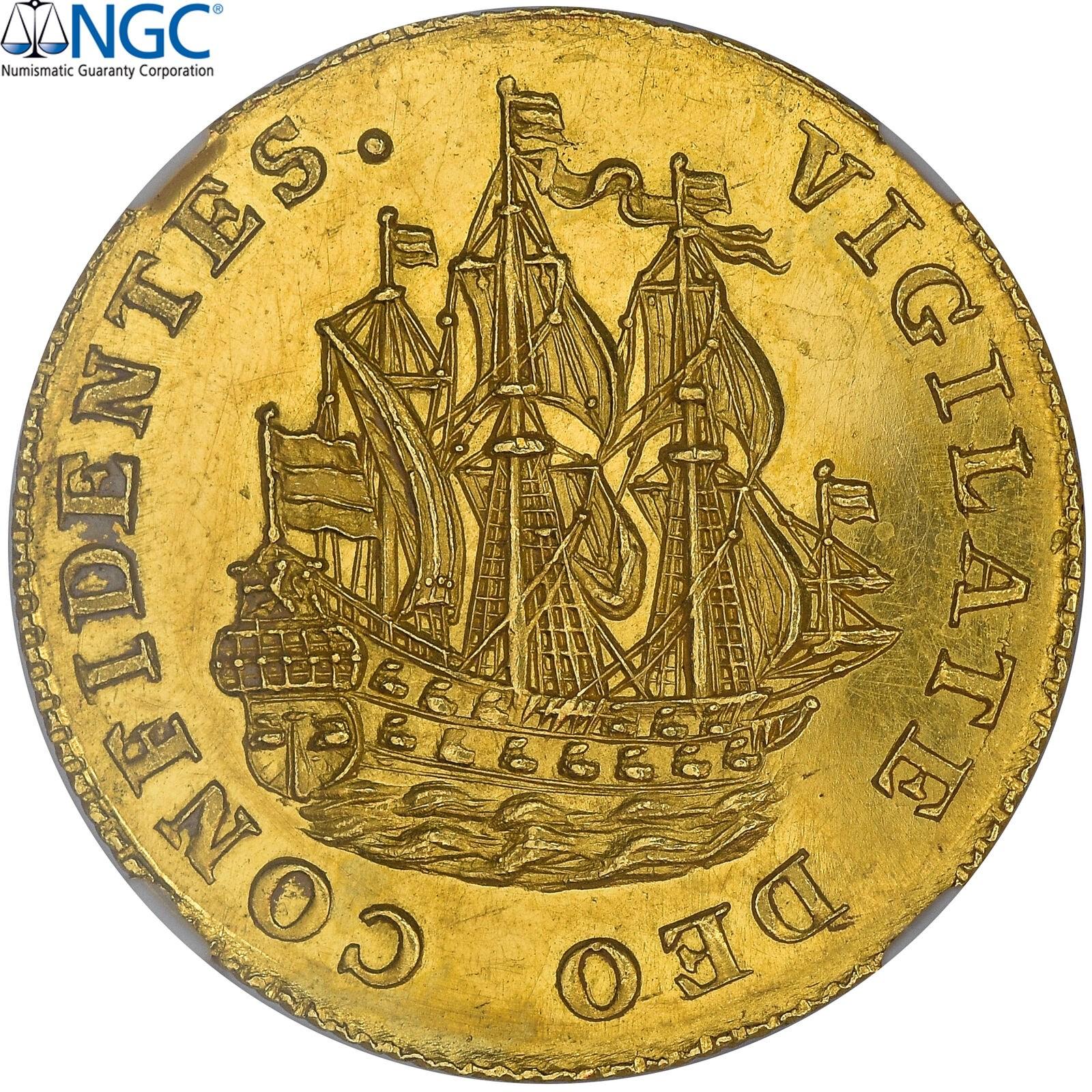 Forsiden: Jo, de findes også i guld. En ”skibsschilling” fra Westfriesland, årgang 1759, i smuk kvalitet. Disse blev lavet af møntmestrene