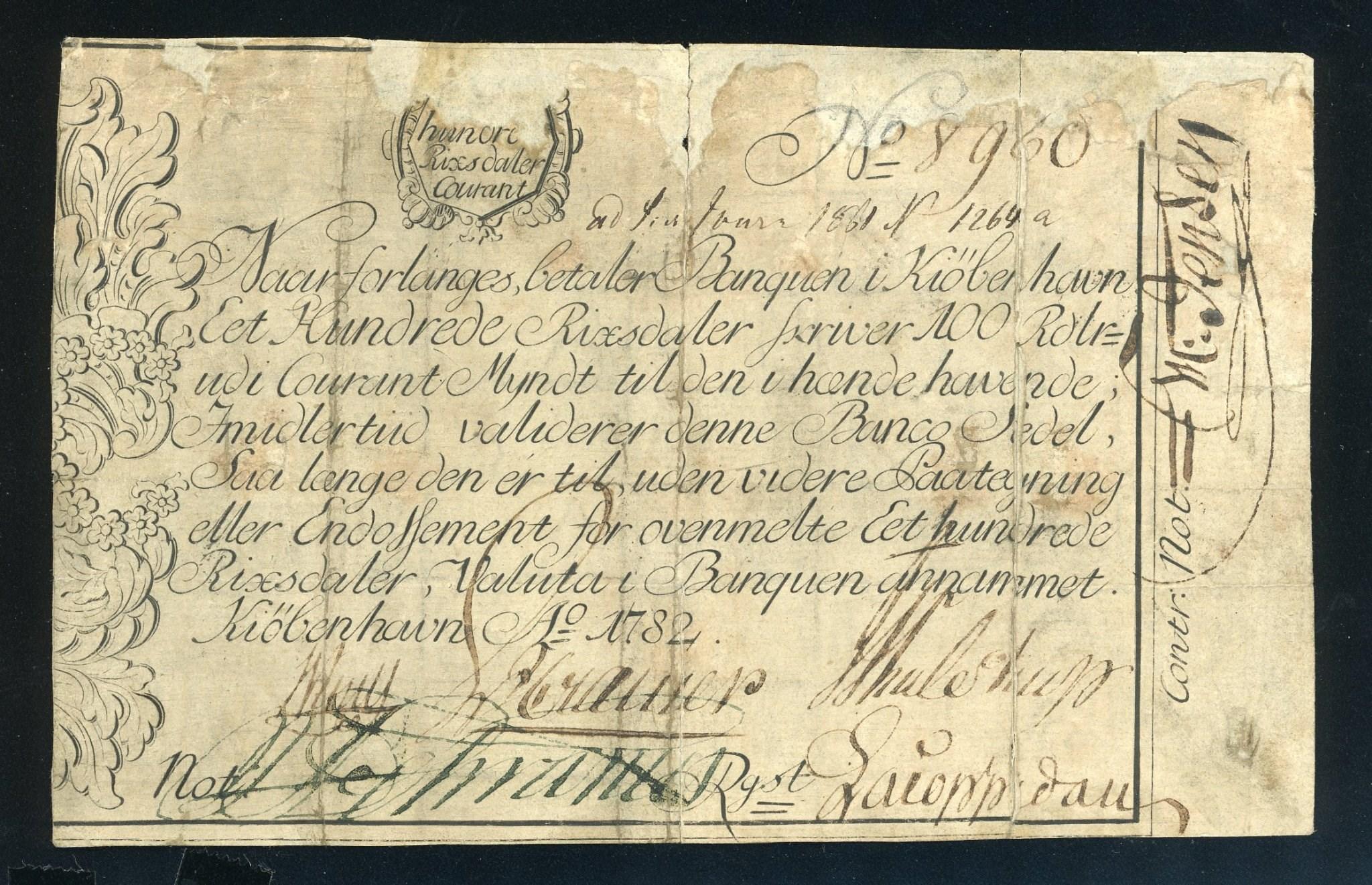 … så sælger de jo også en del sedler på riibe.no. Denne danske 100 rigsdaler 1782 blev solgt i 2022. Registreret i Sieg men ikke prissat...