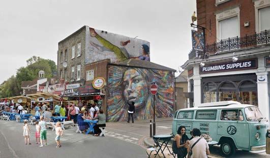 The frst type of events could be Street Markets that occur seasonally, in which restaurants in the area would set stalls to sell their food; potentially working in tandem with the urban gardening network. The stalls could be located along Lee High Road and Burnt Ash Hill, enhancing the connectivity of the center and the other commercial areas located on these streets. Additionally, building on the Lee Green Open Studio event, an annual “Culture Night” could be established. An all-day cultural celebration where art galleries and local businesses would remain open, as well as hosting live street art, performances, music and dance in the streets and parks.