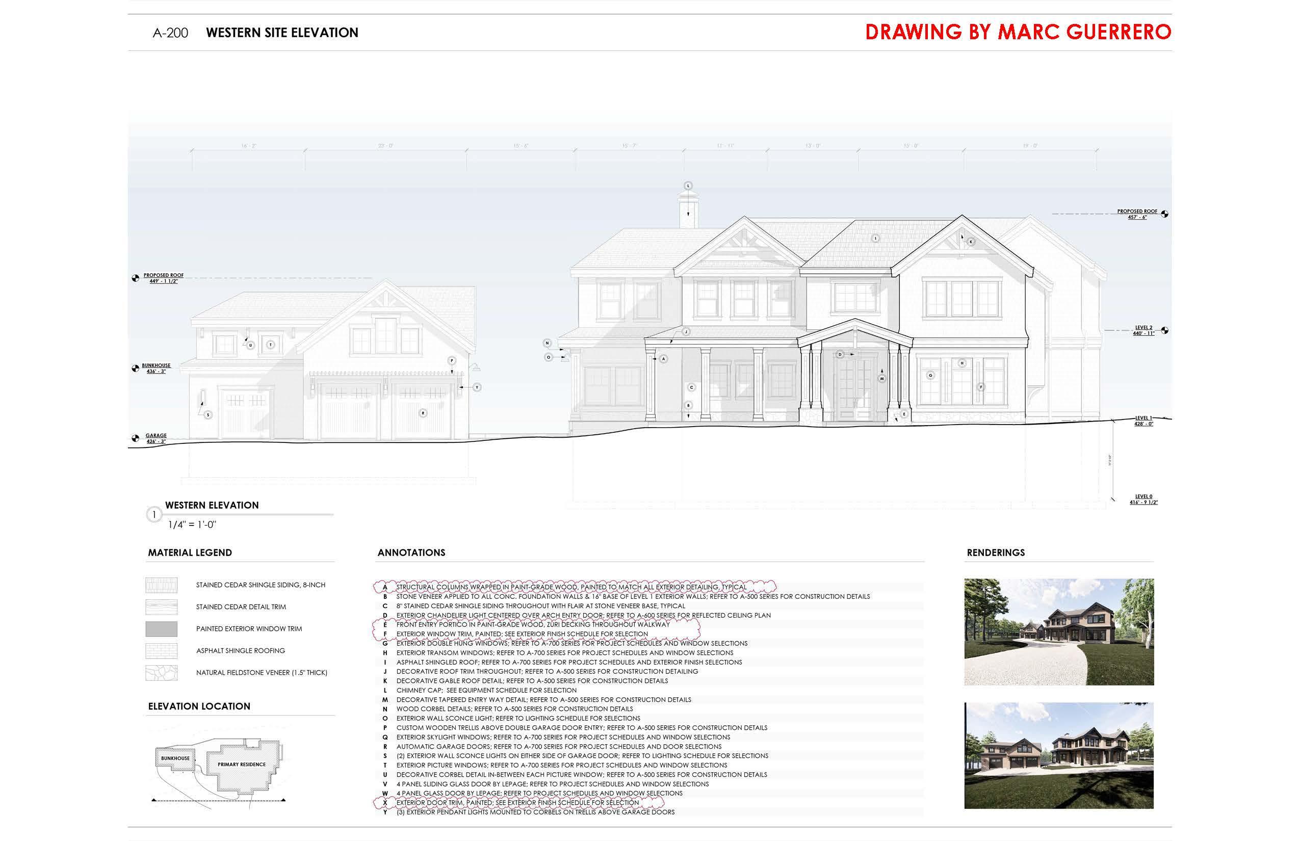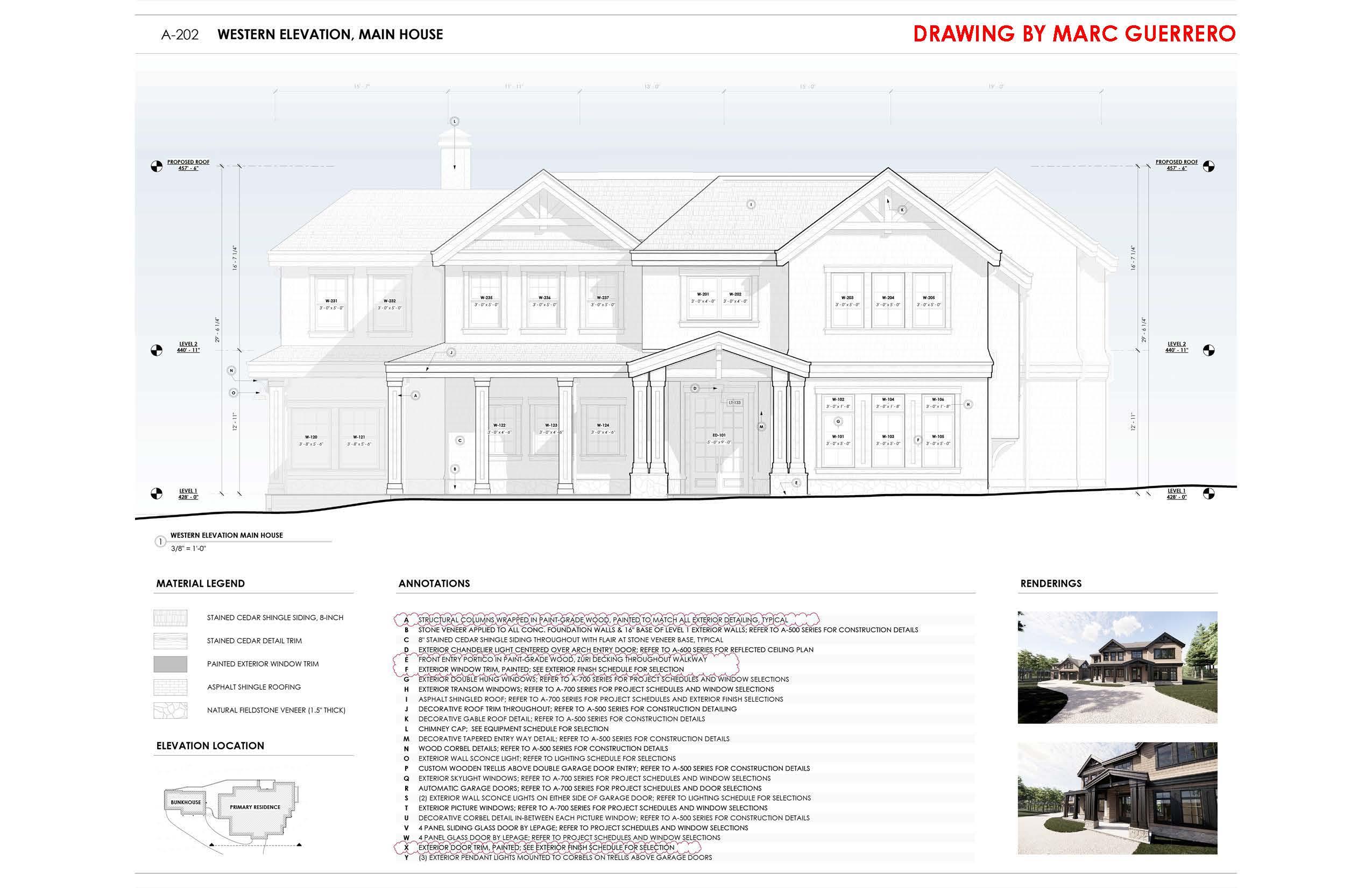 8" STAINED CEDAR SHINGLE SIDING THROUGHOUT WITH FLAIR AT STONE VENEER BASE, TYPICAL W D A H EXTERIOR TRANSOM WINDOWS; REFER TO A-700 SERIES FOR PROJECT SCHEDULES AND WINDOW SELECT ONS ASPHALT SHINGLED ROOF; REFER TO A·700 SERIES FOR PROJECT SCHEDULES AND EXTERIOR FINISH SELECTIONS
