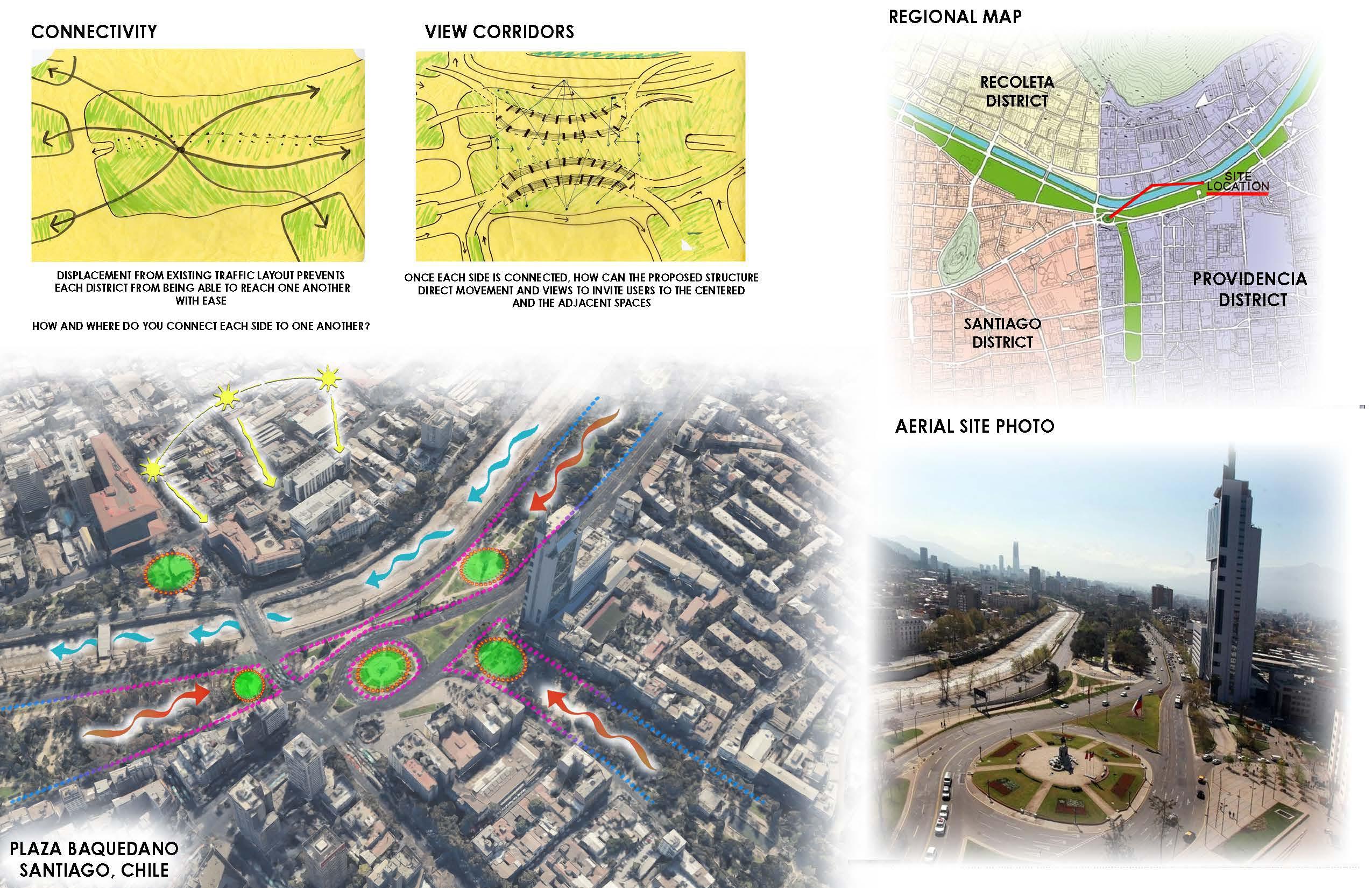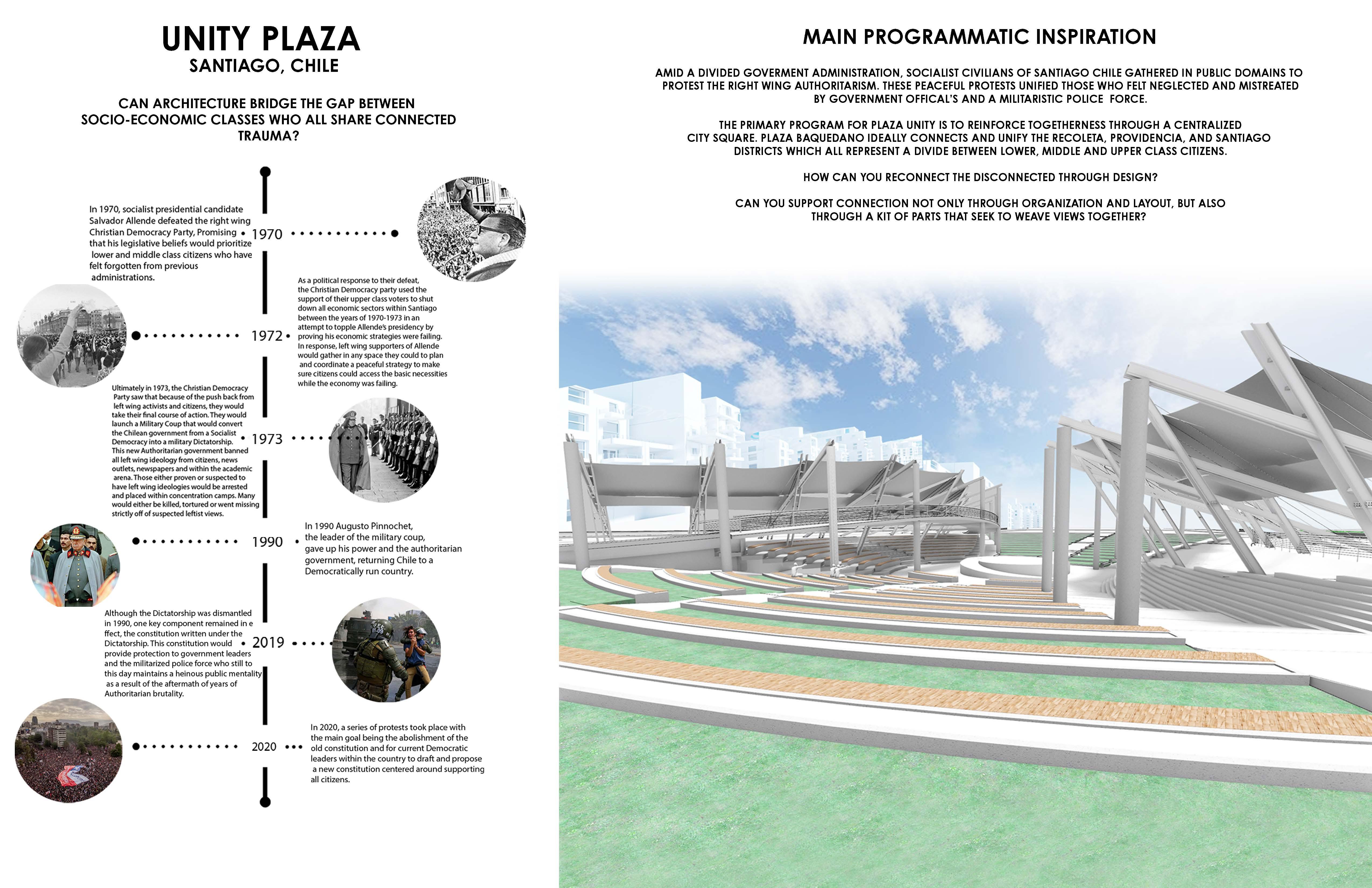 THE PRIMARY PROGRAM FOR PLAZA UNITY IS TO REINFORCE TOGETHERNESS THROUGH A CENTRALIZED CITY SQUARE. PLAZA BAQUEDANO IDEALLY CONNECTS AND UNIFY THE RECOLETA, PROVIDENCIA, AND SANTIAGO DISTRICTS WHICH ALL REPRESENT A DIVIDE BETWEEN LOWER, MIDDLE AND UPPER CLASS CITIZENS.