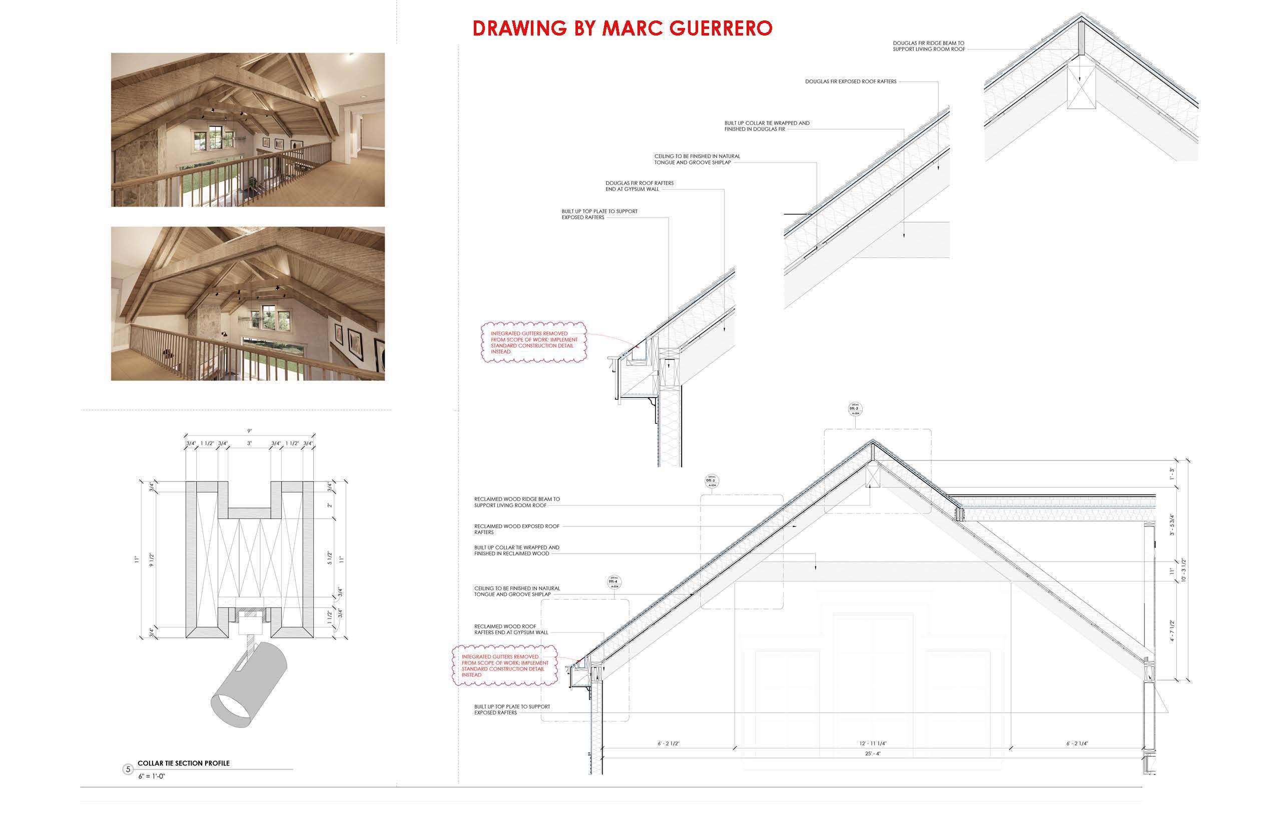 RECLAJMED WOOD ROOF RAAERS END AT GYPSUM WAll BU LT UP TOI' PLATE TO SUPPORT EXPOSED RAFTERS