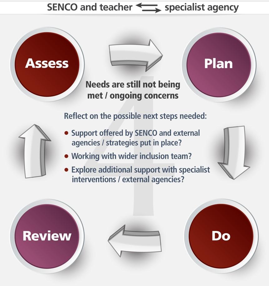 The graduated approach is the golden thread of this handbook, and will support all school staff in noticing, and being curious about, the children and young people in their classes: their strengths and interests, times when they are successful and times when they experience challenges to engagement and curriculum accessibility. The graduated approach, the assess-plan-do-review learning cycle, enables teachers to create an environment where children and young people can maximise their potential and develop the skills needed to prepare for the next stage in education and beyond to adulthood.