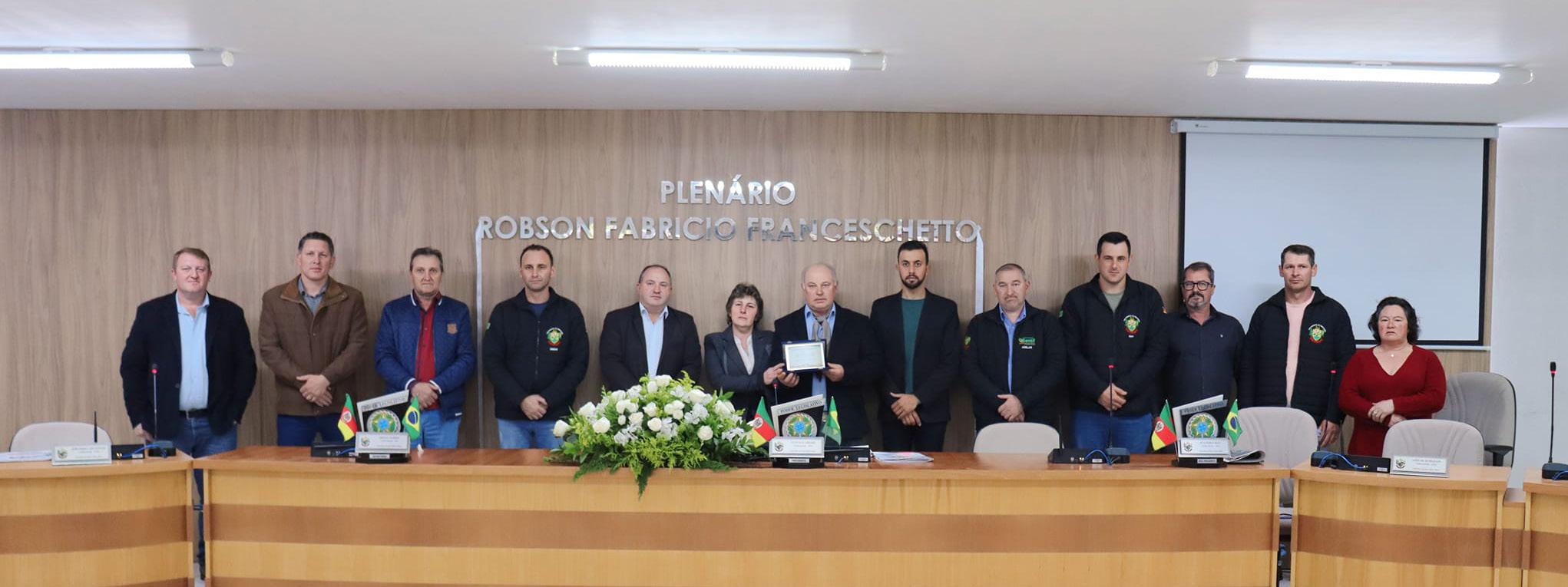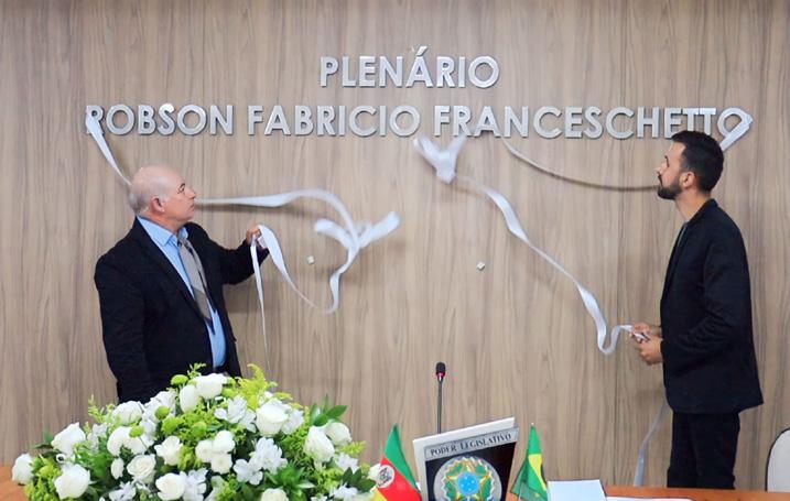 O presidente da Câmara, Gustavo Pressi e Arlindo Franceschetto pai do vereador, fizeram o desenlace da fita de oficialização de inauguração do letreiro de nomeação do Plenário. O prefeito Alcenir Dalmago fez a entrega de uma placa de homenagem aos pais Arlindo e Jandira.