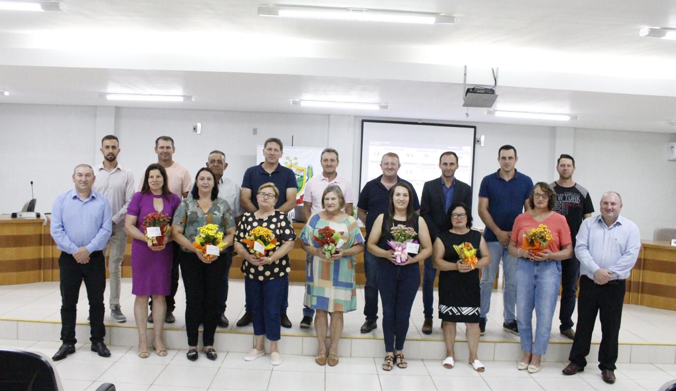 homenageando o município pelo aniversário e também enfatizando a representatividade das mulheres na política, os vereadores Jair Tonin representando a bancada MDB, Diego Fabris representando a bancada do PT, Evandro Biff representando a bancada do PDT, e o vice-prefeito Adelar Silvestri (PT), prefeito Alcenir Dalmago (PDT) e o presidente da Casa, Gustavo.