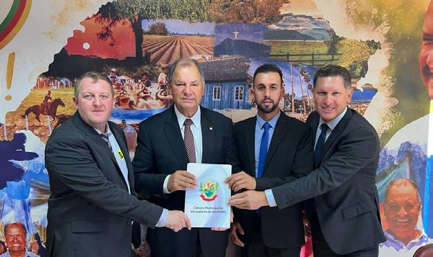 Outro momento marcante foi a participação no evento de criação da Frente Parlamentar em Defesa dos Agricultores no Processo de Demarcações de Terras Indígenas. Essa iniciativa reforça nosso compromisso em apoiar e fortalecer esse setor essencial e principalmente representar e defender os direitos das propriedades de nossos agricultores. Além disso, tive a satisfação idealizar e criar o Projeto Vereadores Mirins, que visa incentivar a participação política dos jovens e formar cidadãos conscientes e engajados com nossa comunidade. Acredito que investir na educação política é fundamental para garantir a cidadania e um futuro promissor para Gentil. Também, destaco a criação do Projeto Galeria das Ex-Parlamentares Gentilenses Mulheres, uma iniciativa pioneira que valoriza e fortalece a representatividade das mulheres na política e na sociedade. A galeria das mulheres é uma maneira de homenagear e destacar essas mulheres vereadoras que contribuem signifi cativamente para o desenvolvimento de Gentil. Através dessa iniciativa, buscamos promover a igualdade de gênero e dar visibilidade às vozes femininas em nosso município.