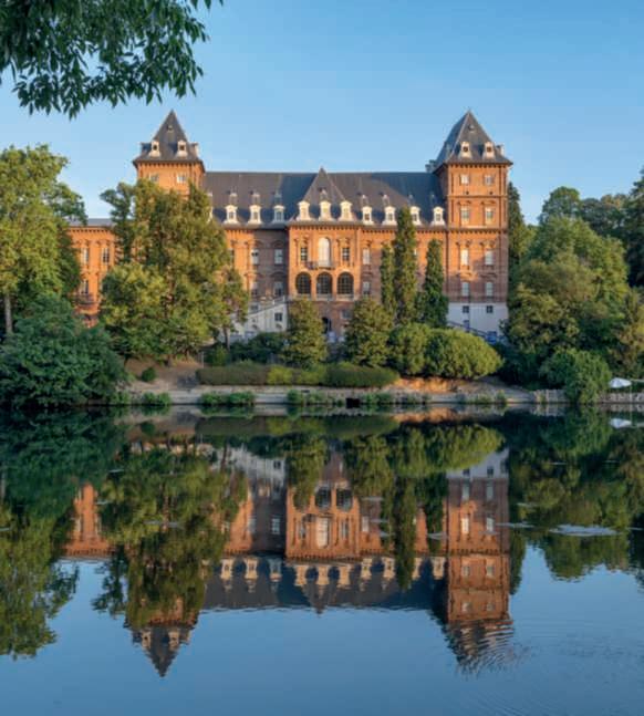 On the previous pages, a view of the ReggiadiVenaria refected inthe Peschiera inthe arco Basso. On this page, views of the CastellodelValentino, located on the banks of the o. Thecurrent layout is due to the architects CarloandAmedeo di Castellamonte, who, on the occasion of the marriage of the daughter ofHenry of France to the rinceof iedmont ittorio Amedeo in the frst halfof the thcentury, transformeda pre-existing th-century nucleus, inspiredby Frencharchitecture The main entranceisfromthe o.