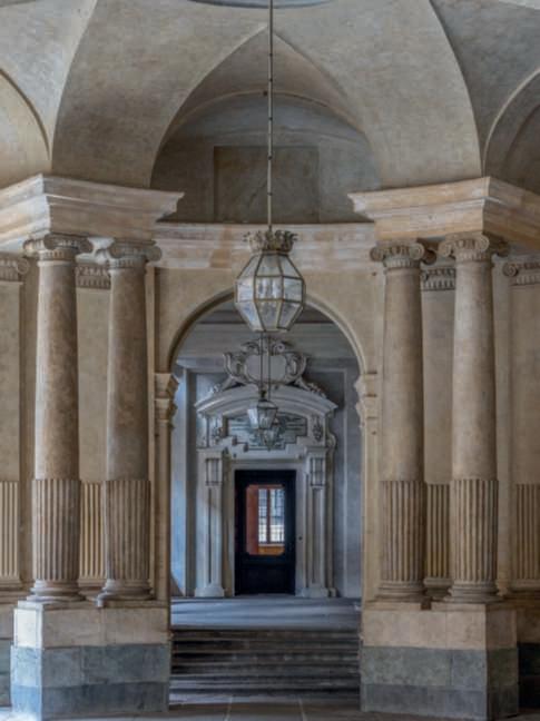 On this page, above, the curved façade of Palazzo Carignano, overlooking the piazza of the samename.A masterpiece of Baroquearchitectureand the homeof the Chamber of eputies ofthe egno di ardegna, the alazzo is the work of the odenese architect Guarino Guarini, who designed it from onwards. For the time,its architectural solutions were considered avant-garde:Guarinihad, in fact, adapted Bernini’s designs,whichwere never realised,for the ouvre.Below, the oval-shaped entrance from which double concave-convex staircases leadupto the large centralhall.