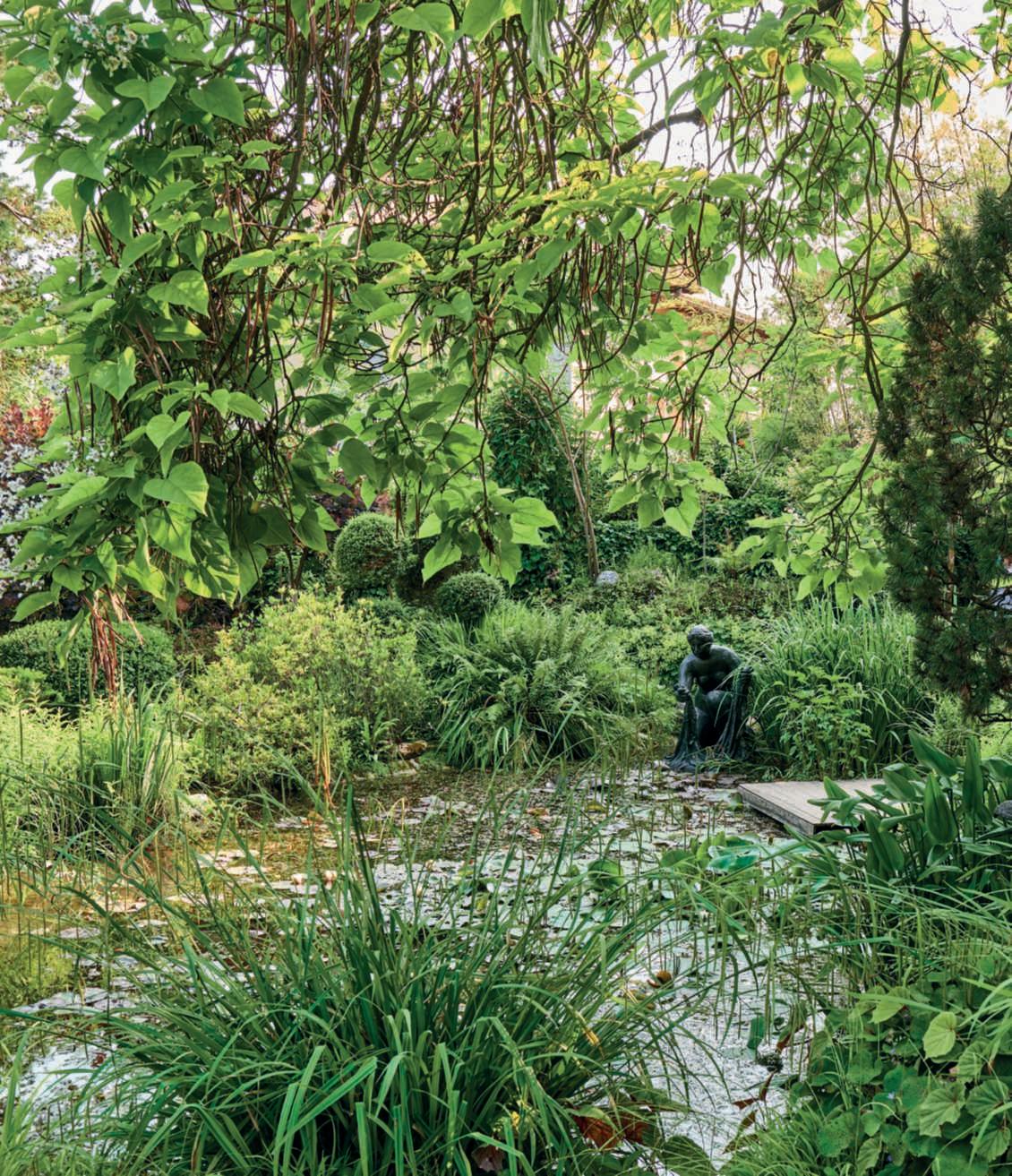 Nelle pagine precedenti, unavistadel LagoKoi con la scultura LaMusa di François-Auguste-René Rodin (1840-1917).Inqueste pagine, Lagrandelaveuse accroupie di Pierre-Auguste Renoir(1841-1919)sullerive del LagoMonet.