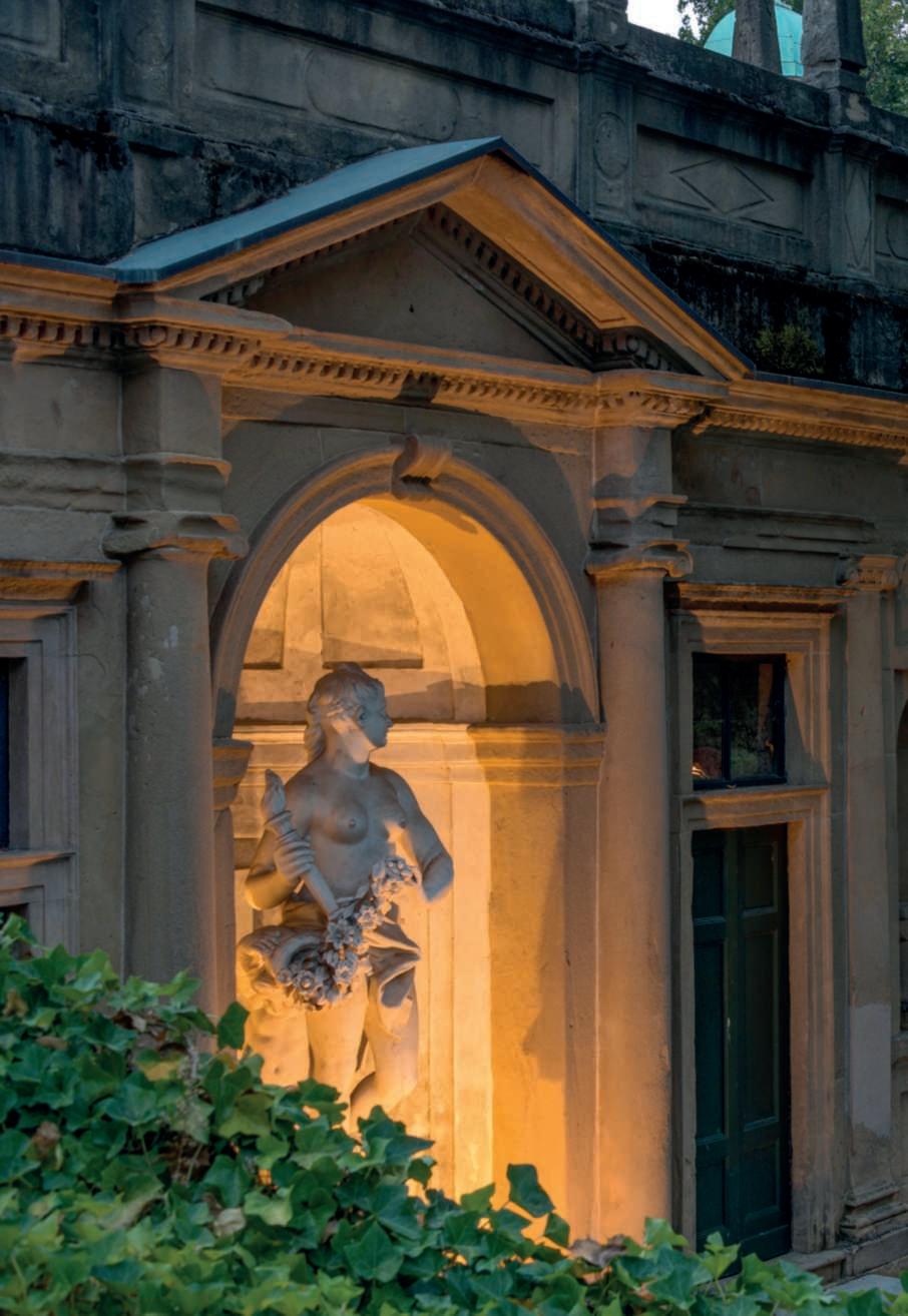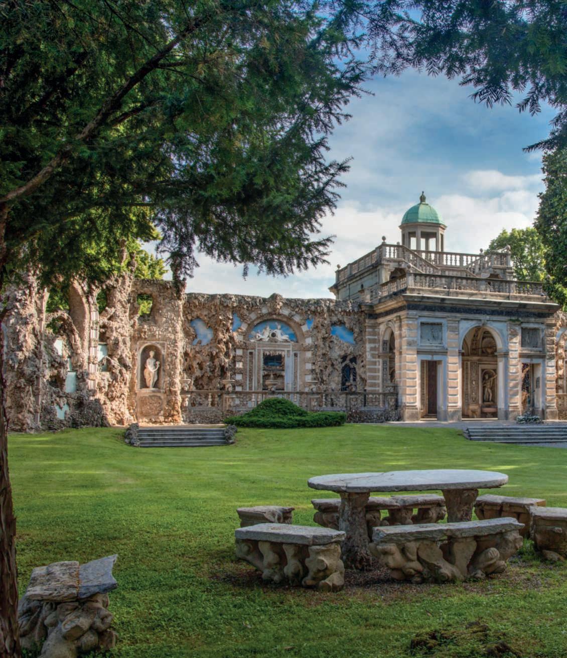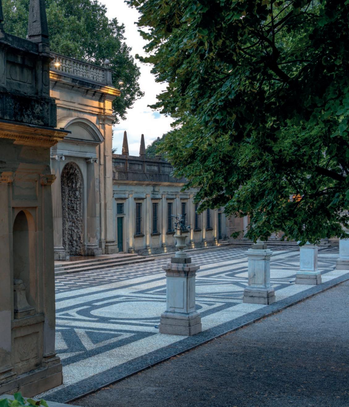 On these pages, a view of the southern façade and the Pronao of the Nymphaeum of VillaViscontiBorromeoLitta, with stone balustrades and the portico, and of the Water Tower. On the previous pages, a detail of the hemicycle of the Old Grottoes