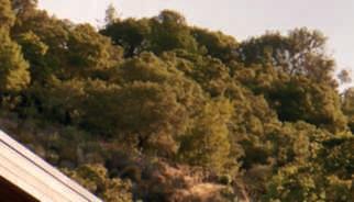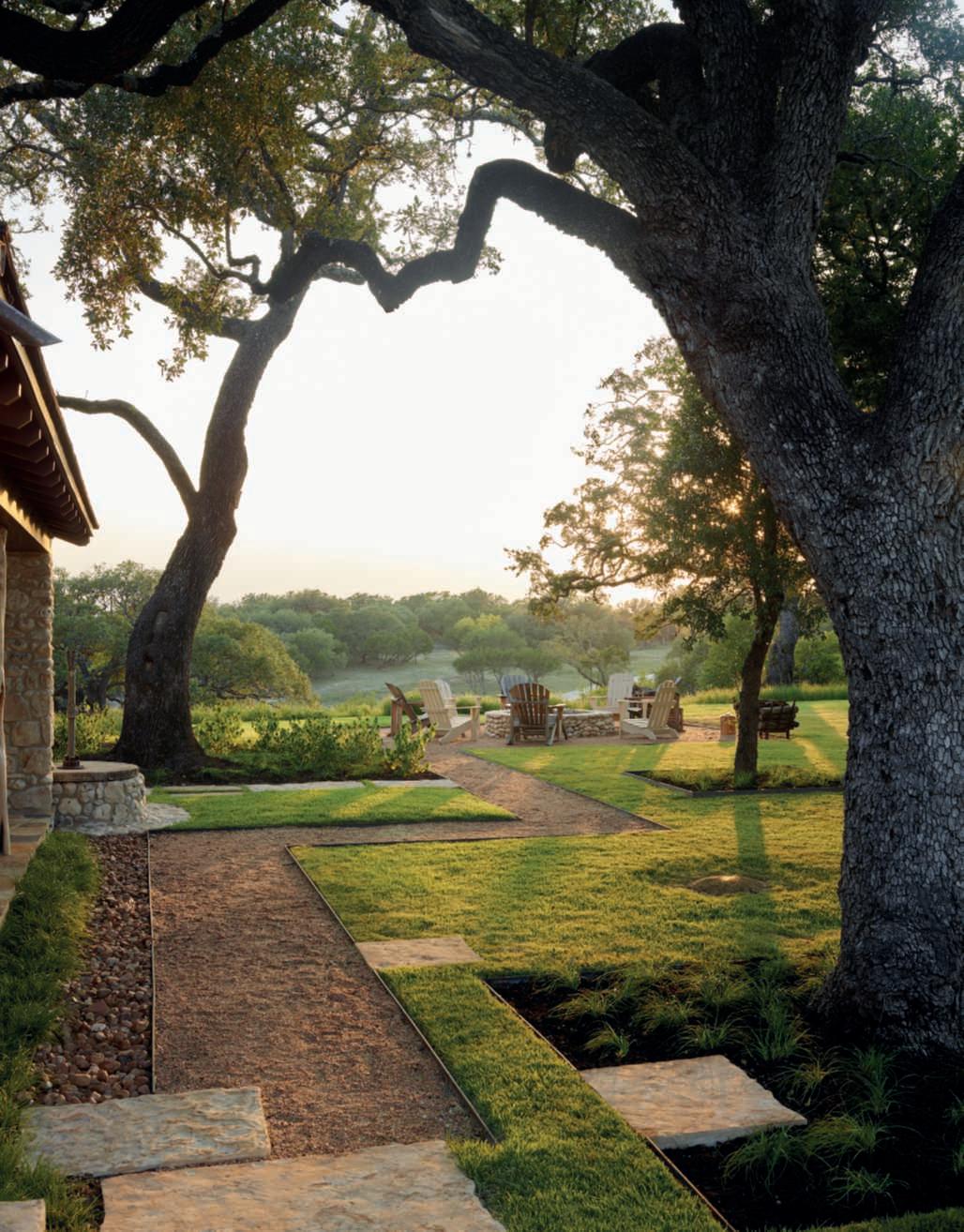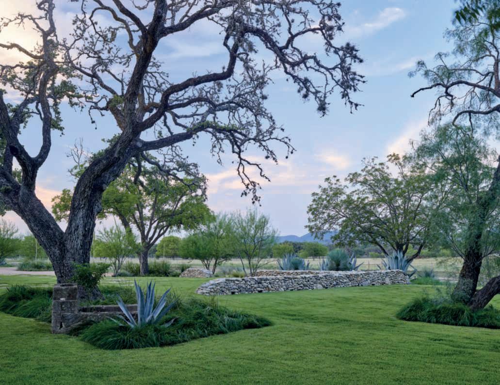 In questa pagina, altre viste del giardino dove i muretticostruiti con ciottoli raccolti lungo il fiume Sabinal definiscono gli spazi senza impedire le viste sul paesaggio e diventando un elemento decorativo Alberi senescenti di quercia si alternano a mature Neltuma glandulosa var. glandulosa,a giovani Parkinsonia x ‘Desert Museum’, Agave americana e Dasylirion wheeleri. Nella pagina disinistra, vicino alla residenzaprincipale un’intima area relax con le classiche sedieAdirondack e un focolare